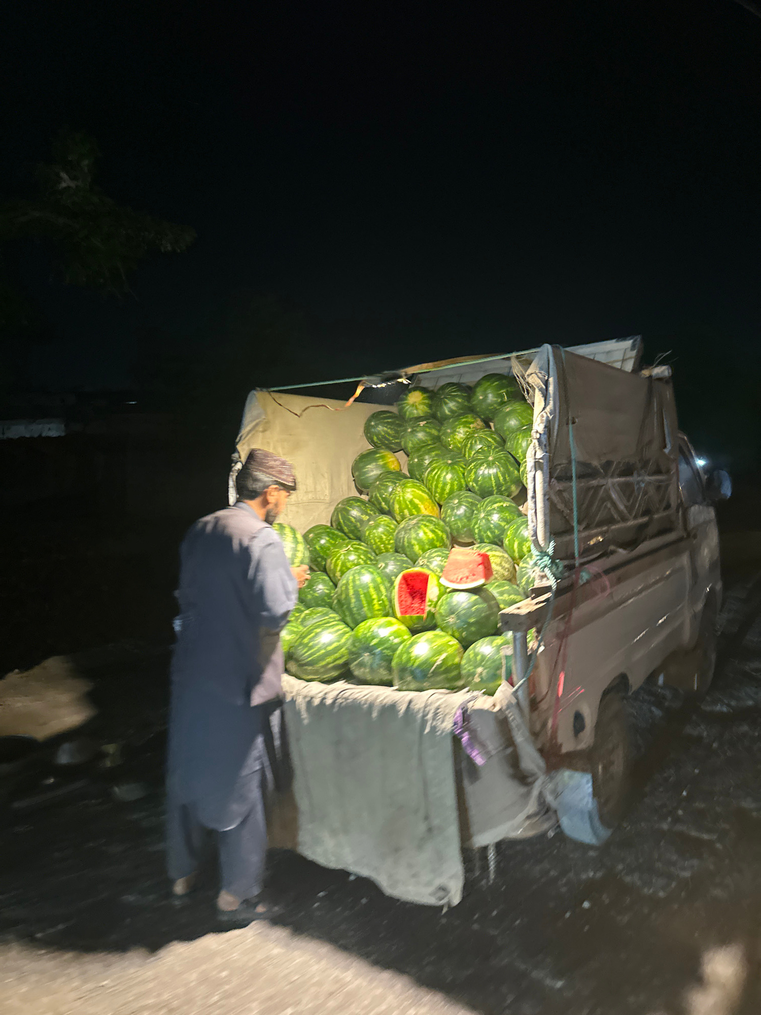 The image captures a nighttime scene, likely in Quetta City Tehsil, Pakistan, focused on a roadside vendor and his produce. A man, dressed in a dark shirt and pants with a beard and a cap or head cove…read more