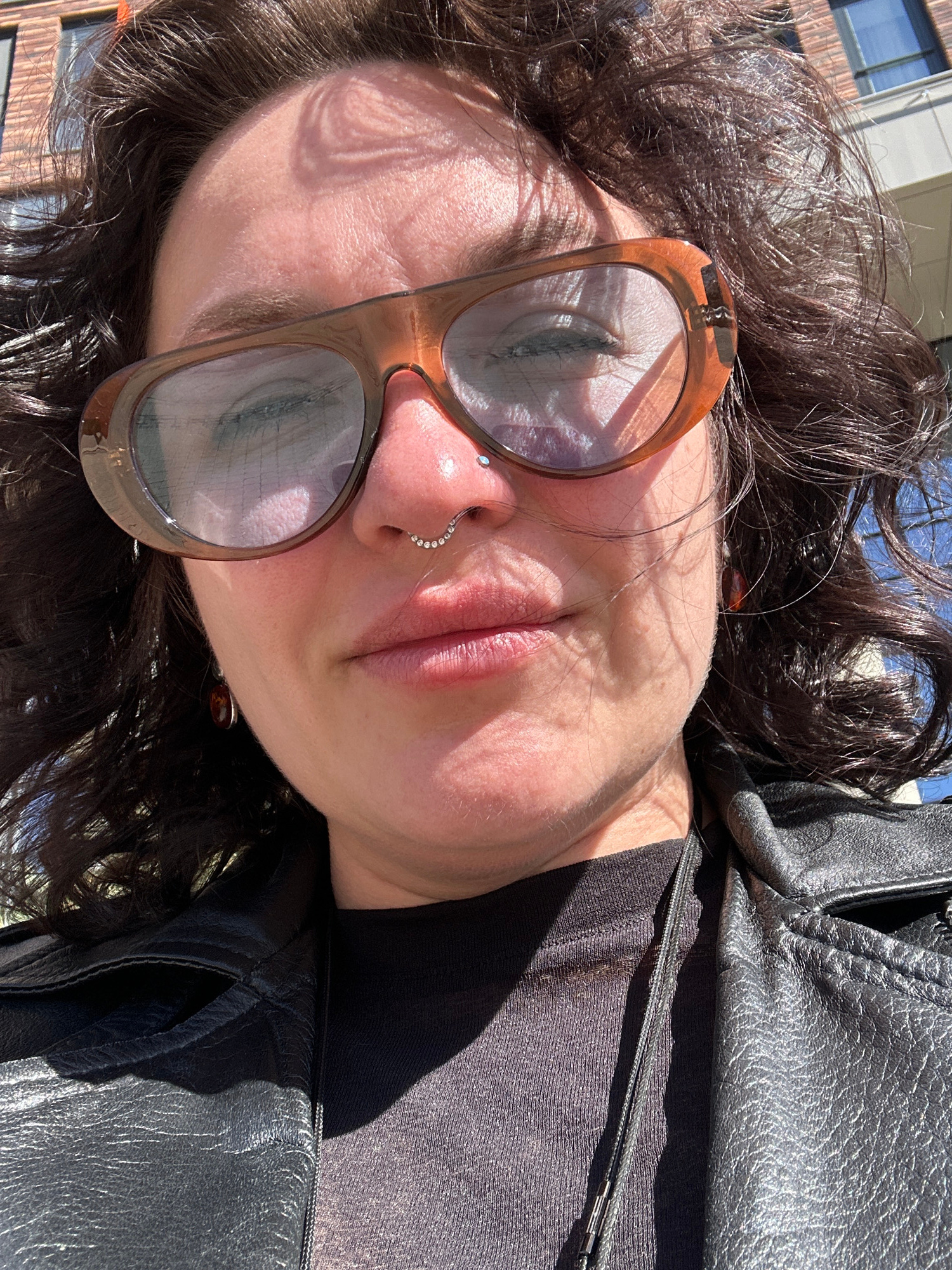A woman is shown in a close-up, angled portrait. She is wearing glasses with a brown frame, and a nose ring with multiple stones. She is wearing a black shirt and a black leather jacket. Dark brown ha…read more