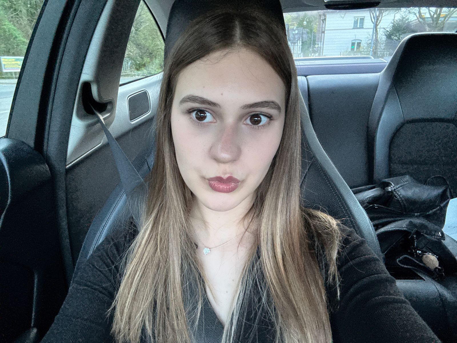 A selfie shot from a vehicle's interior. The subject is a young woman with long, light brown hair wearing a black top and a delicate necklace. She is wearing a seatbelt. Outside the car window, a buil…read more