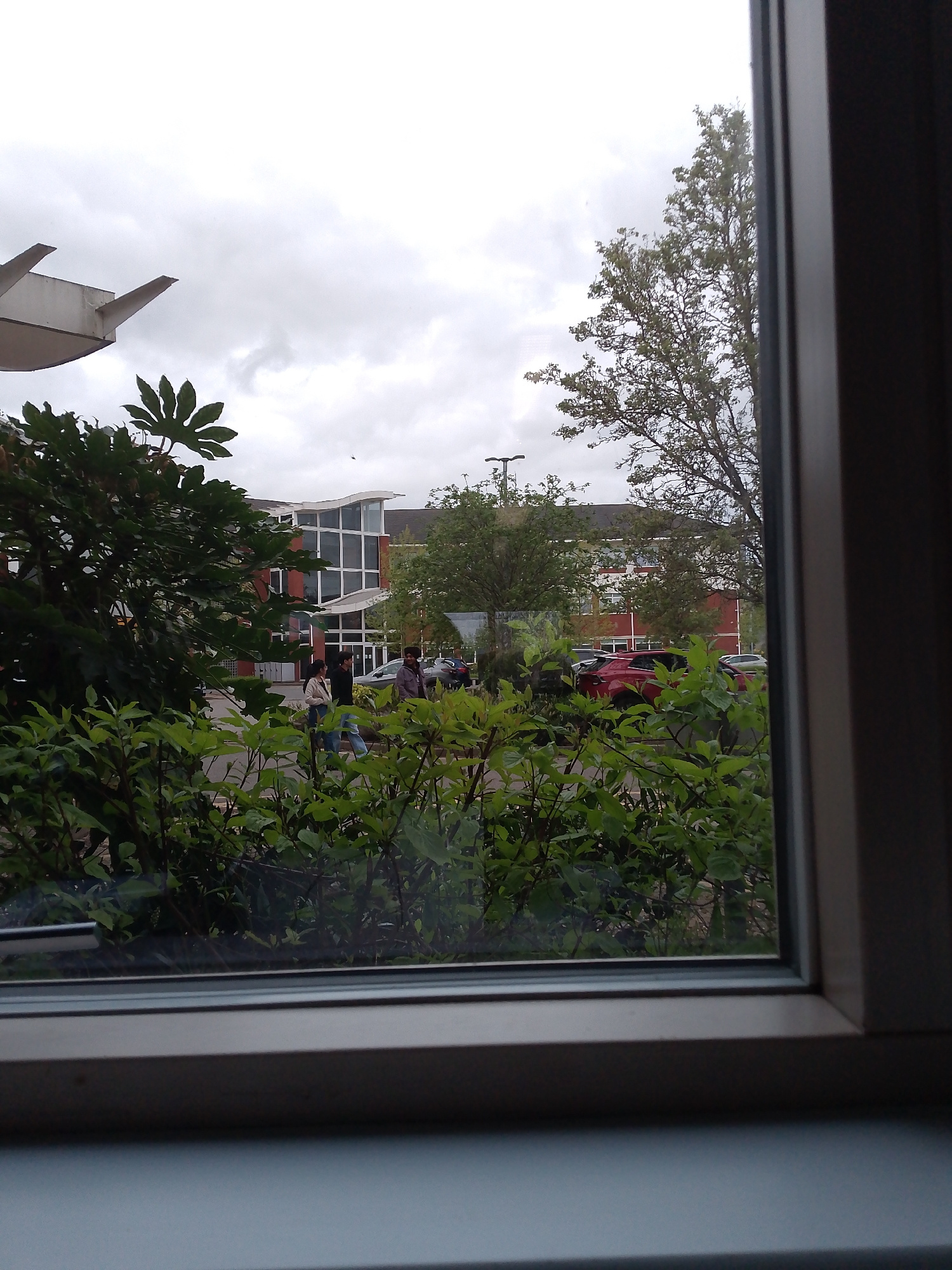 The image captures an outdoor scene viewed through a window, providing a glimpse of a cloudy day in Coventry, United Kingdom. The foreground is dominated by the window frame, particularly on the right…read more