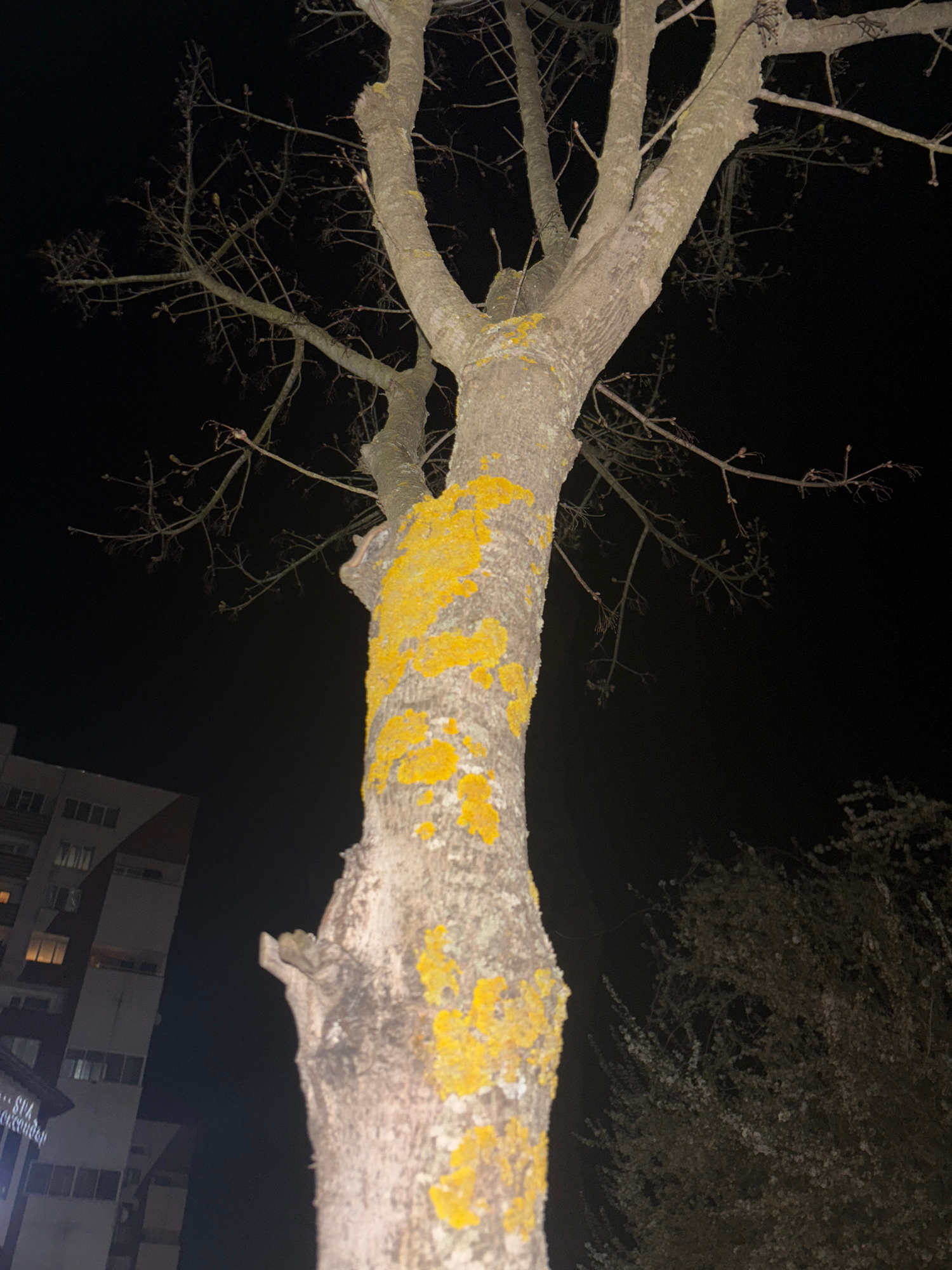 A low-angle, nighttime photograph shows the bare branches of a tree covered in yellow lichen, with a building and another tree in the background. The main branch extends horizontally across the frame,…read more
