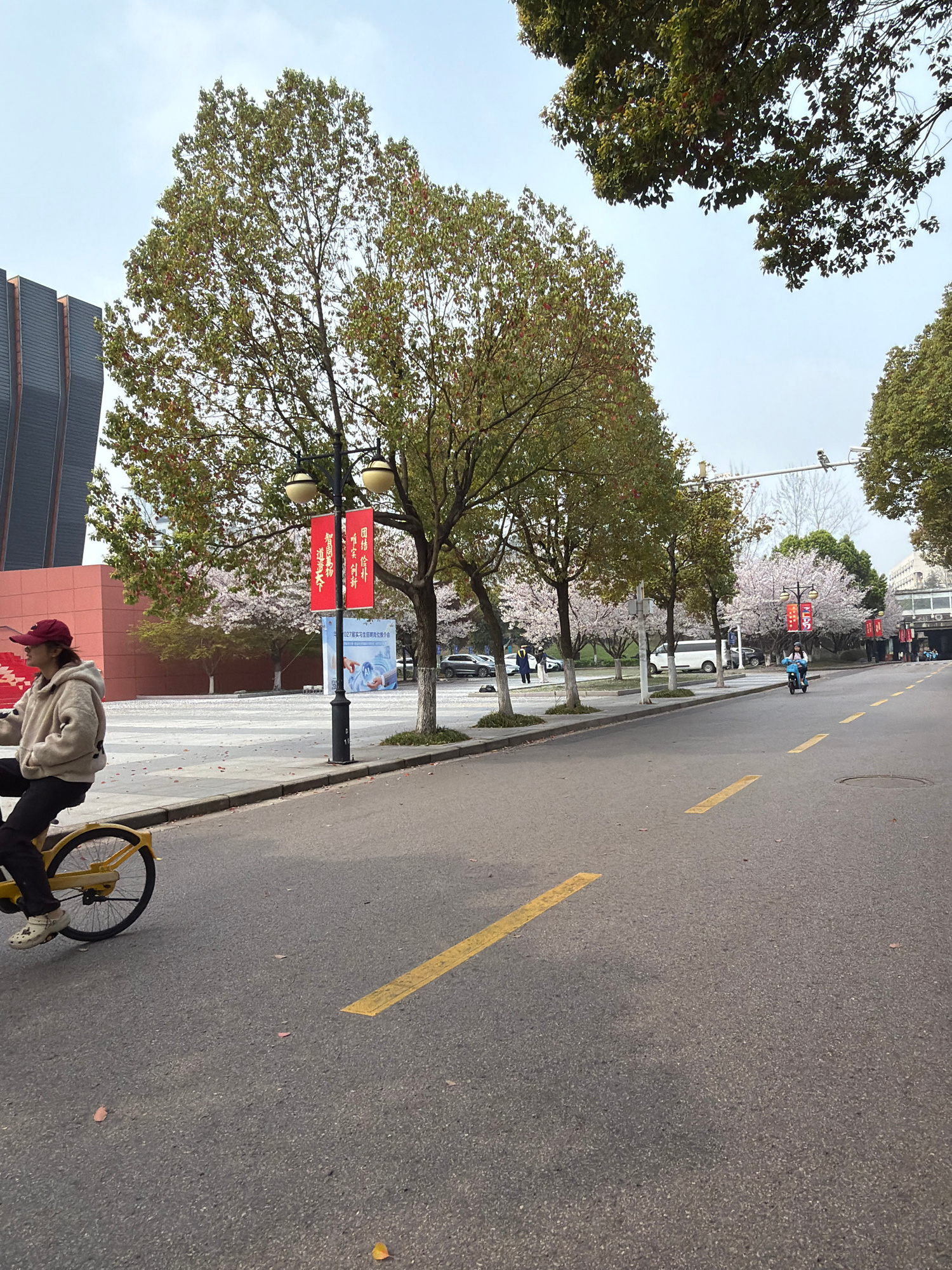 The image depicts a street scene in Jiangning District, China. A person in a grey hoodie and red hat stands with a yellow bicycle. A building with a red facade is visible behind them. Along the street…read more