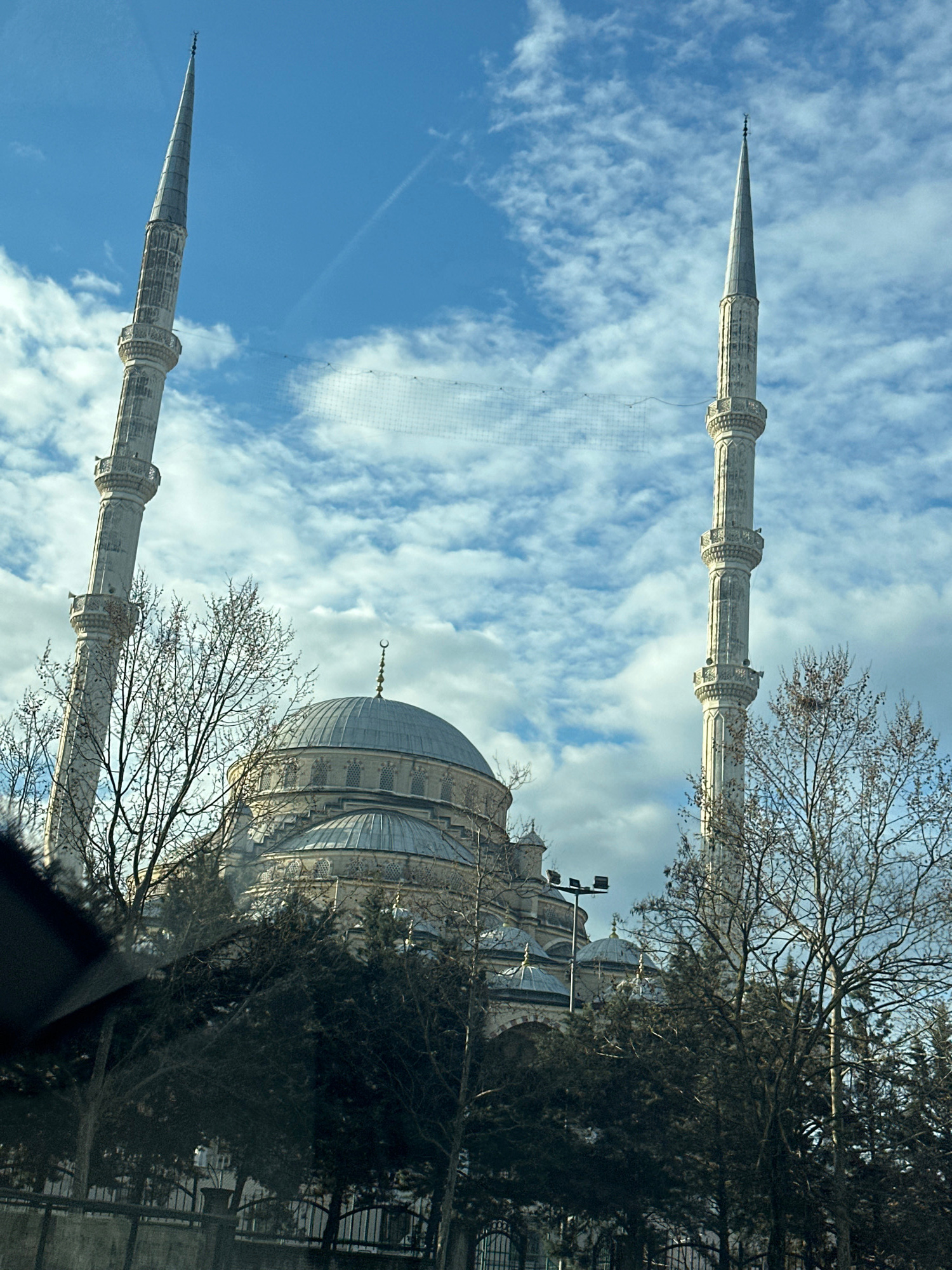 The image captures a low-angle view of a mosque in Ataşehir, Turkey, likely taken from a vehicle. The mosque features a large central dome and two tall, slender minarets that reach towards a sky fille…read more