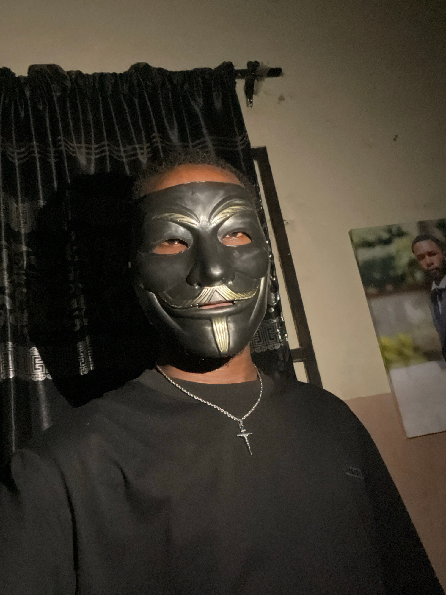 The image shows a person lying down, possibly on a bed, wearing a black mask. The person is also wearing a black top and a silver necklace with a cross pendant. A framed picture hangs on the wall abov…read more