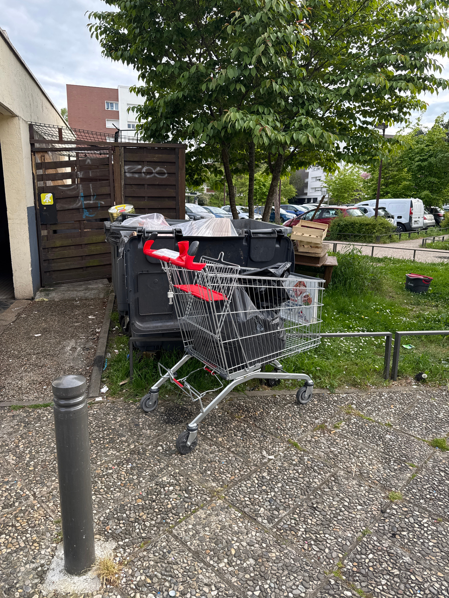 The image depicts a scene of urban neglect in Les Ulis, France. A shopping cart, filled with black trash bags, rests against a black wheelie bin overflowing with refuse. Adjacent to the bin is a brown…read more
