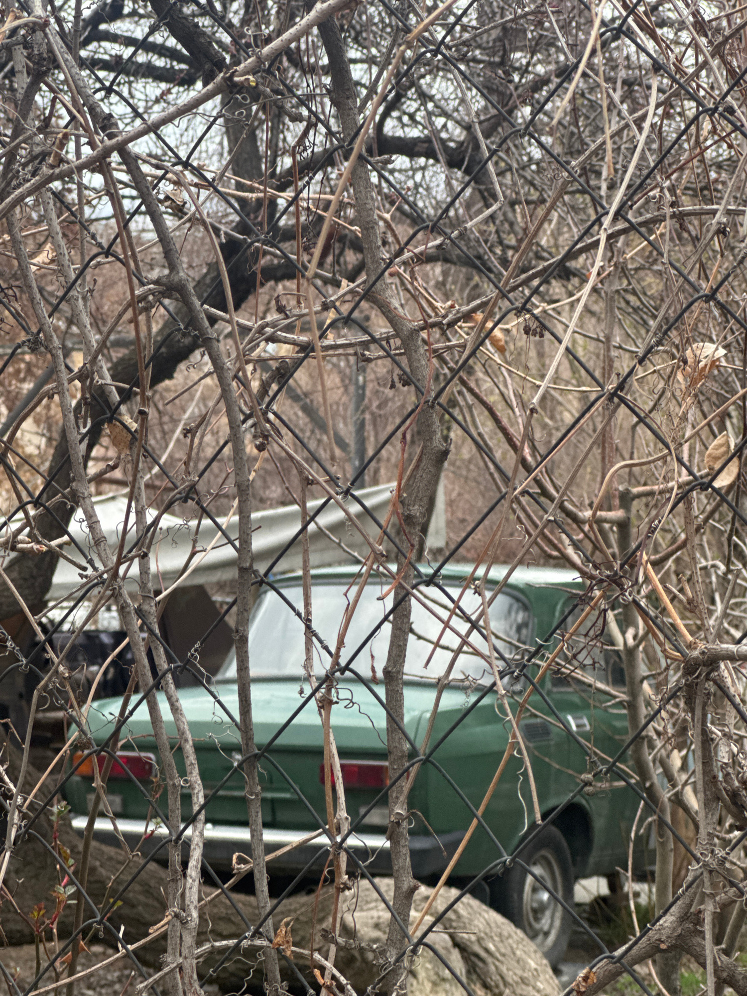 A partially obscured green and white car is viewed through a chain-link fence overgrown with bare branches and vines. The car is positioned at an angle relative to the viewer, revealing its side and r…read more