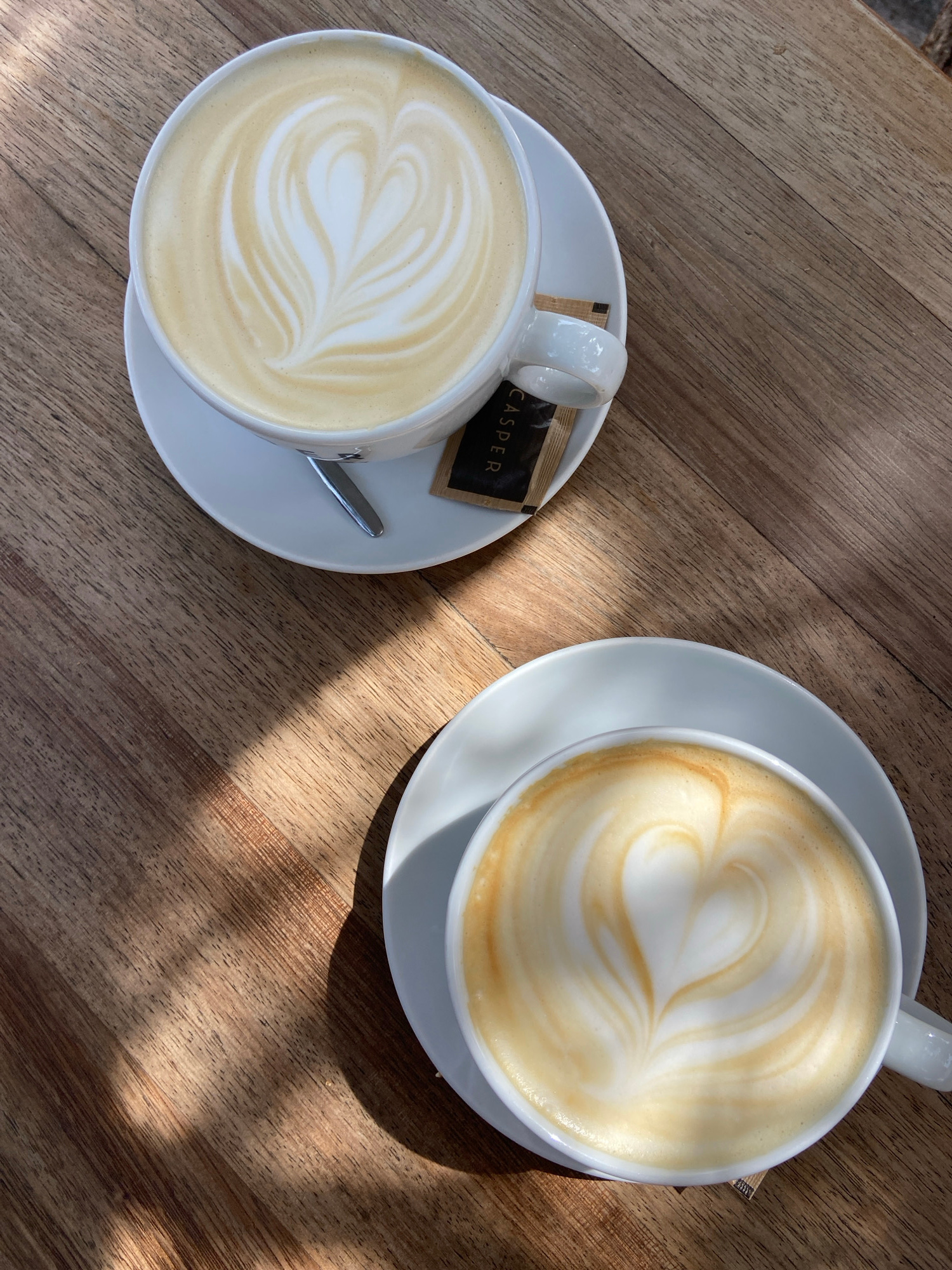 This overhead shot captures two artfully prepared lattes, each featuring intricate heart-shaped latte art, served in white cups on matching saucers. The beverages are placed on a warm, light brown woo…read more
