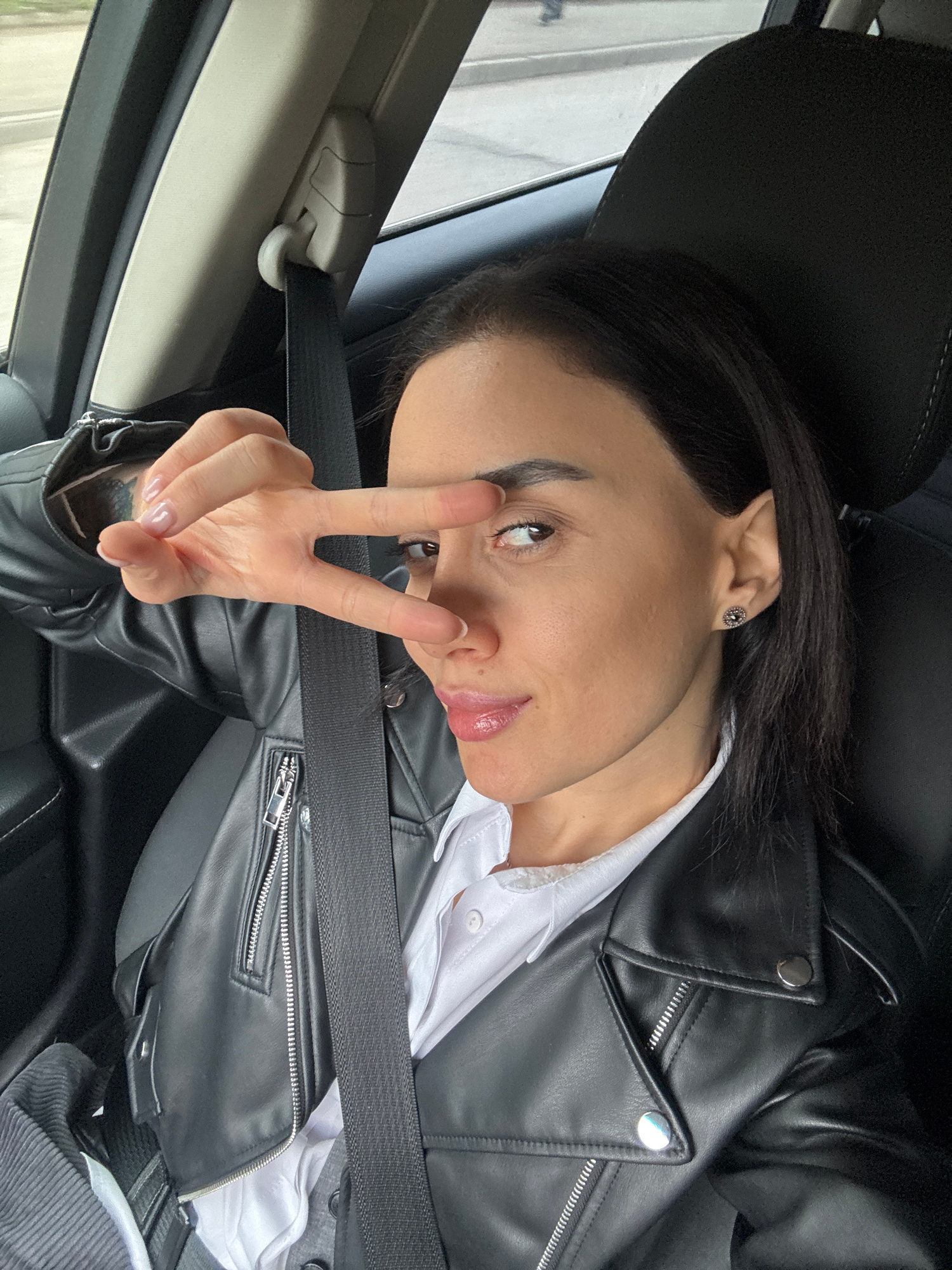 A young woman sits in the driver's seat of a car, wearing a black leather jacket over a white shirt and a fastened seatbelt. She has dark hair and is wearing an earring. She is holding up a peace sign…read more