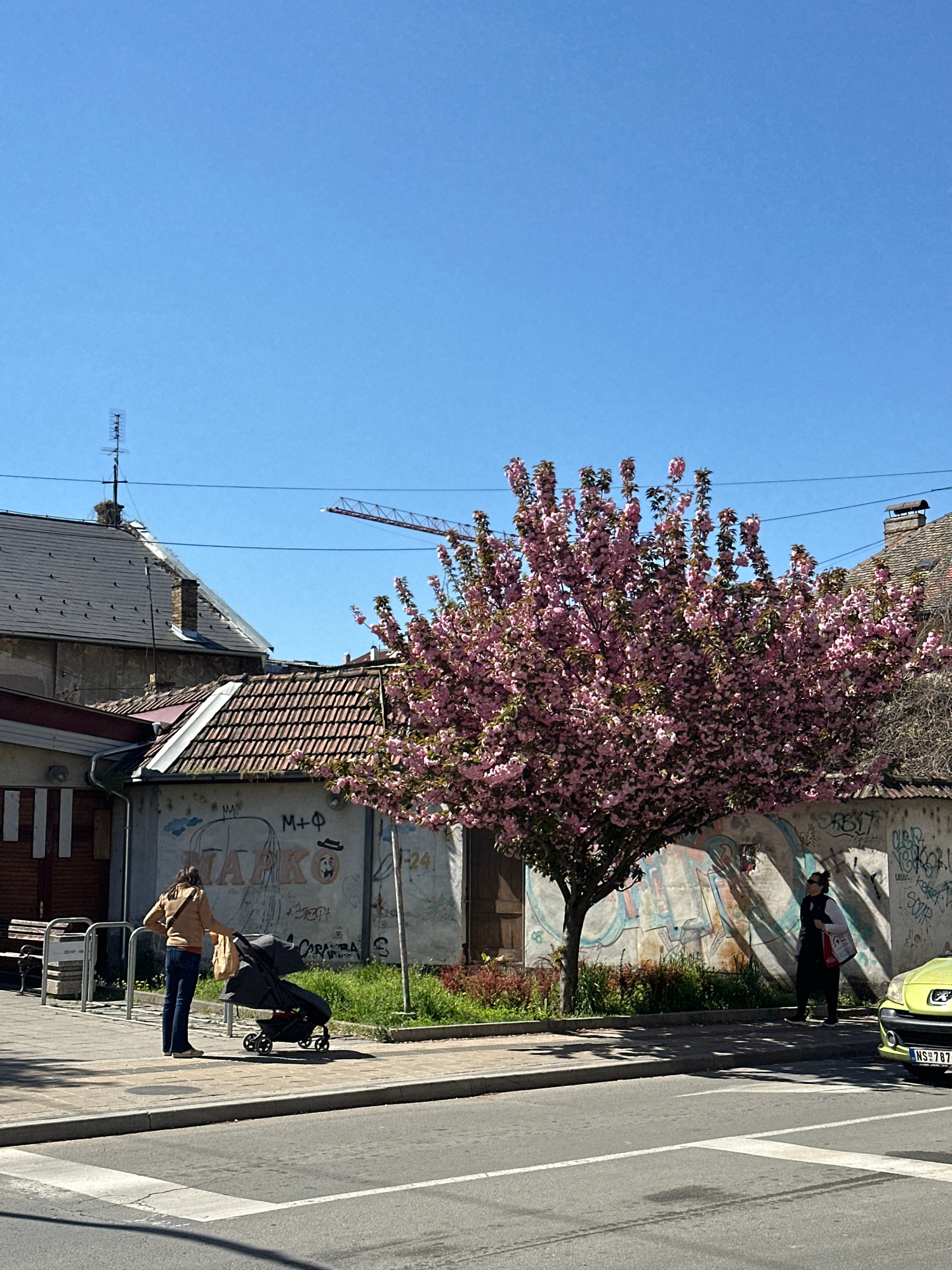 The scene is in Novi Sad, Serbia, featuring a vibrant cherry blossom tree in full bloom. A woman in a tan jacket and jeans stands next to a stroller parked on a sidewalk next to a street, in front ofโฆread more