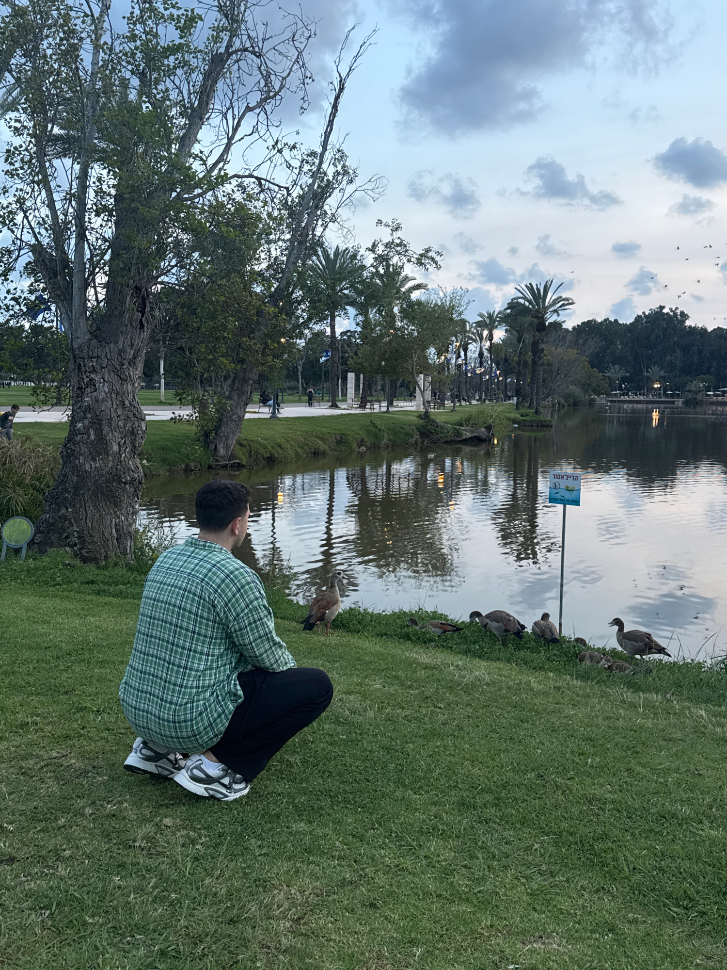A park landscape in Ramat Gan, Israel, shows a person sitting on a grassy bank alongside a body of water where waterfowl congregate. The individual, dressed in a green plaid shirt and dark pants, appe…read more