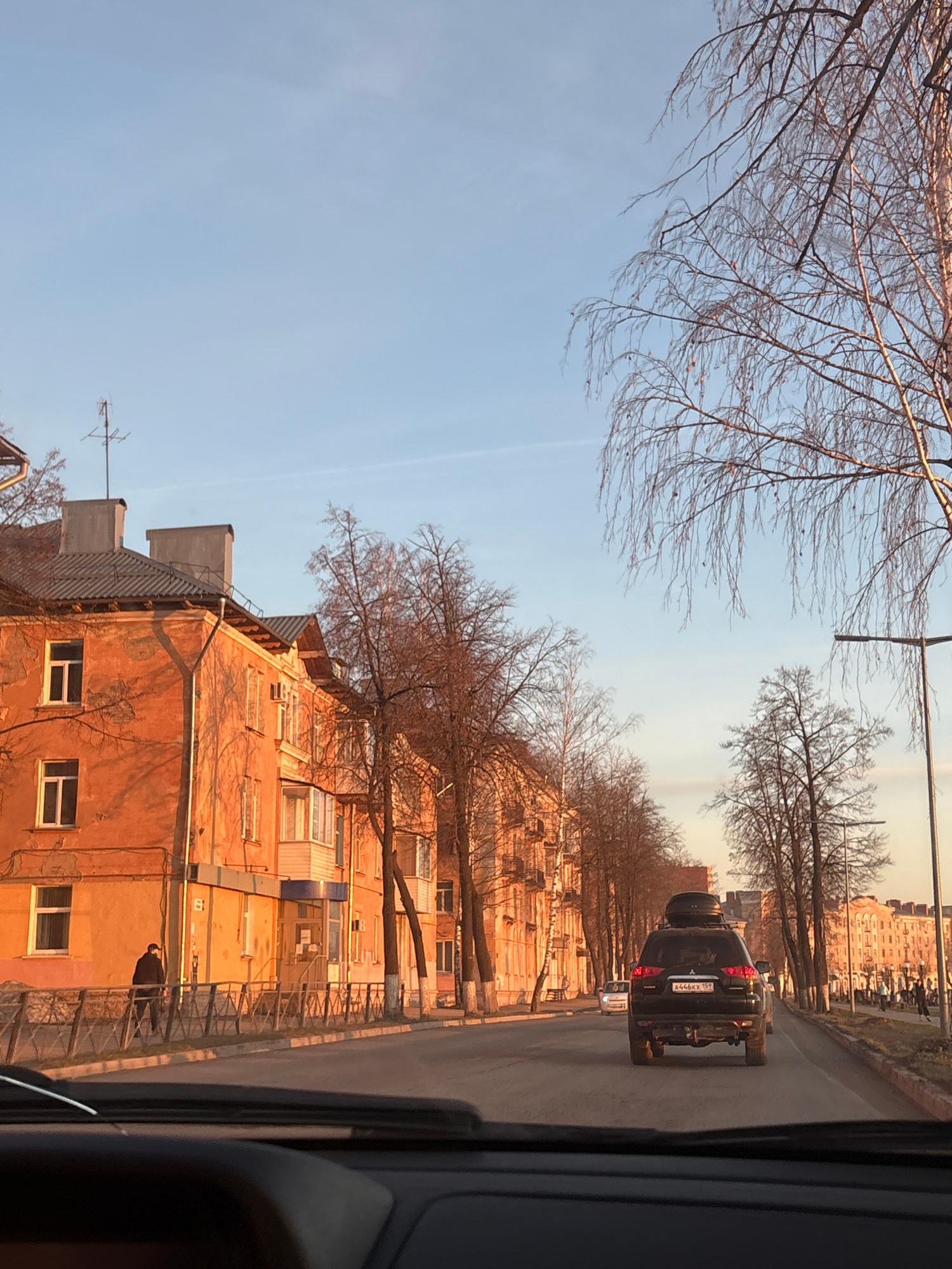 The image captures a street scene in what appears to be late autumn or early spring, given the bare deciduous trees. The perspective is from within a vehicle, looking forward and slightly to the right…read more
