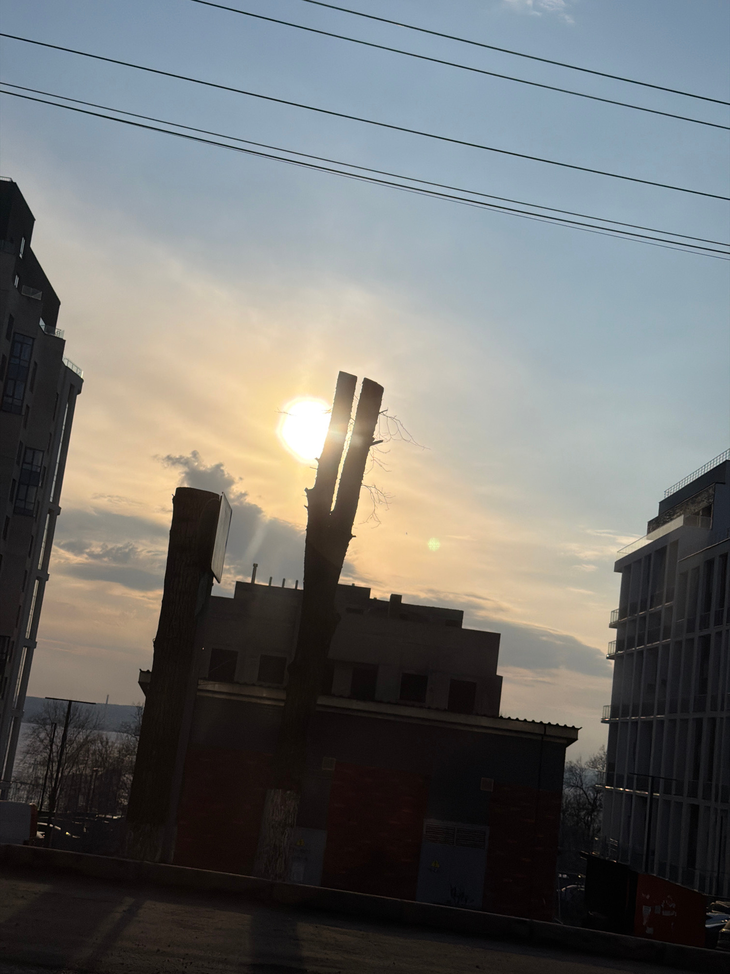 The image shows a view of the sky and buildings, likely in an urban environment. In the foreground, two tree trunks, recently cut off, block the view of the sun, which shines through the gaps. Above a…read more