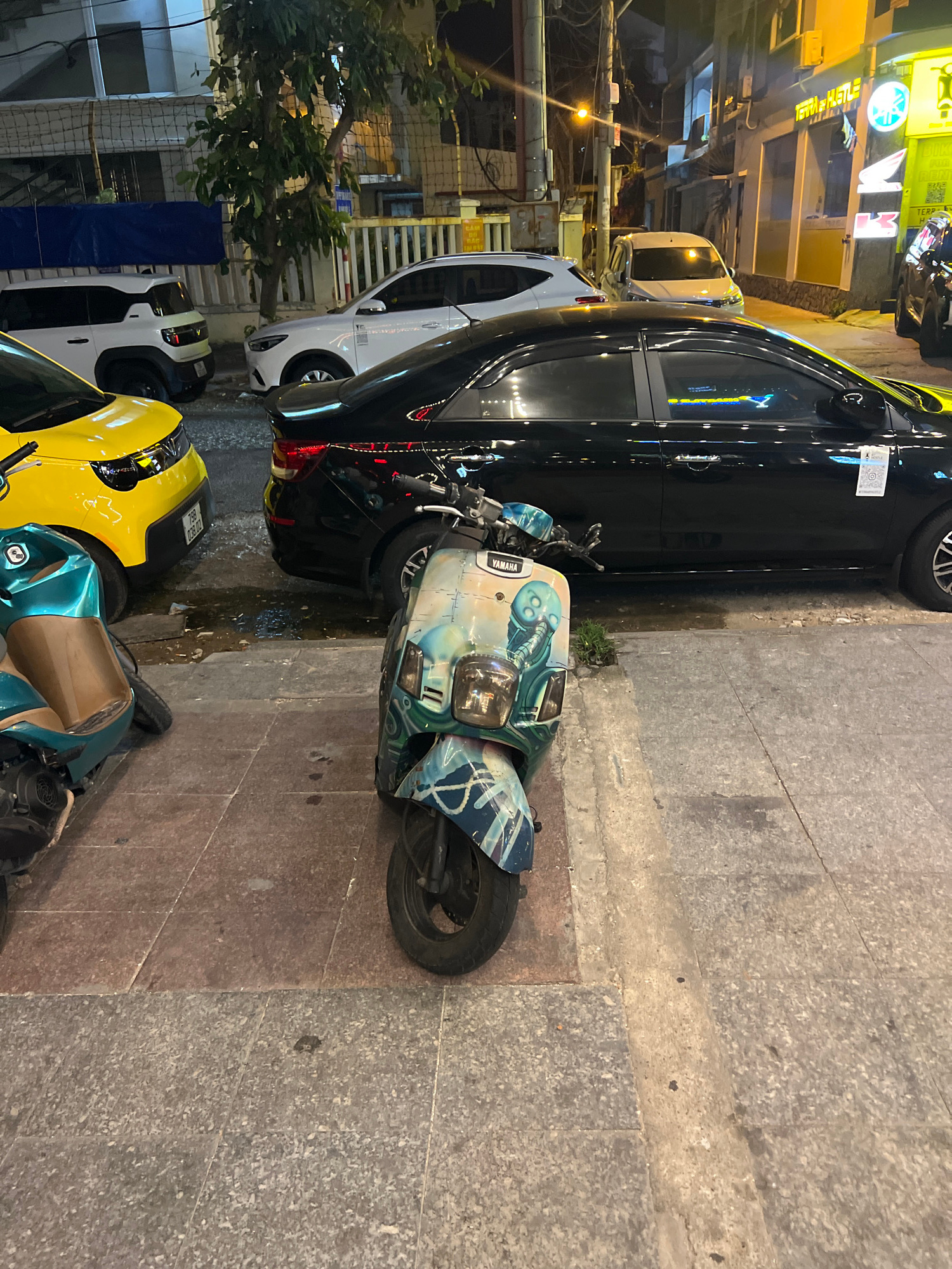 The image depicts a street scene in what is presumed to be Bắc Nha Trang, Vietnam based on the cultural cues and location. A black car is parked parallel to the curb on a paved surface. A Yamaha scoot…read more