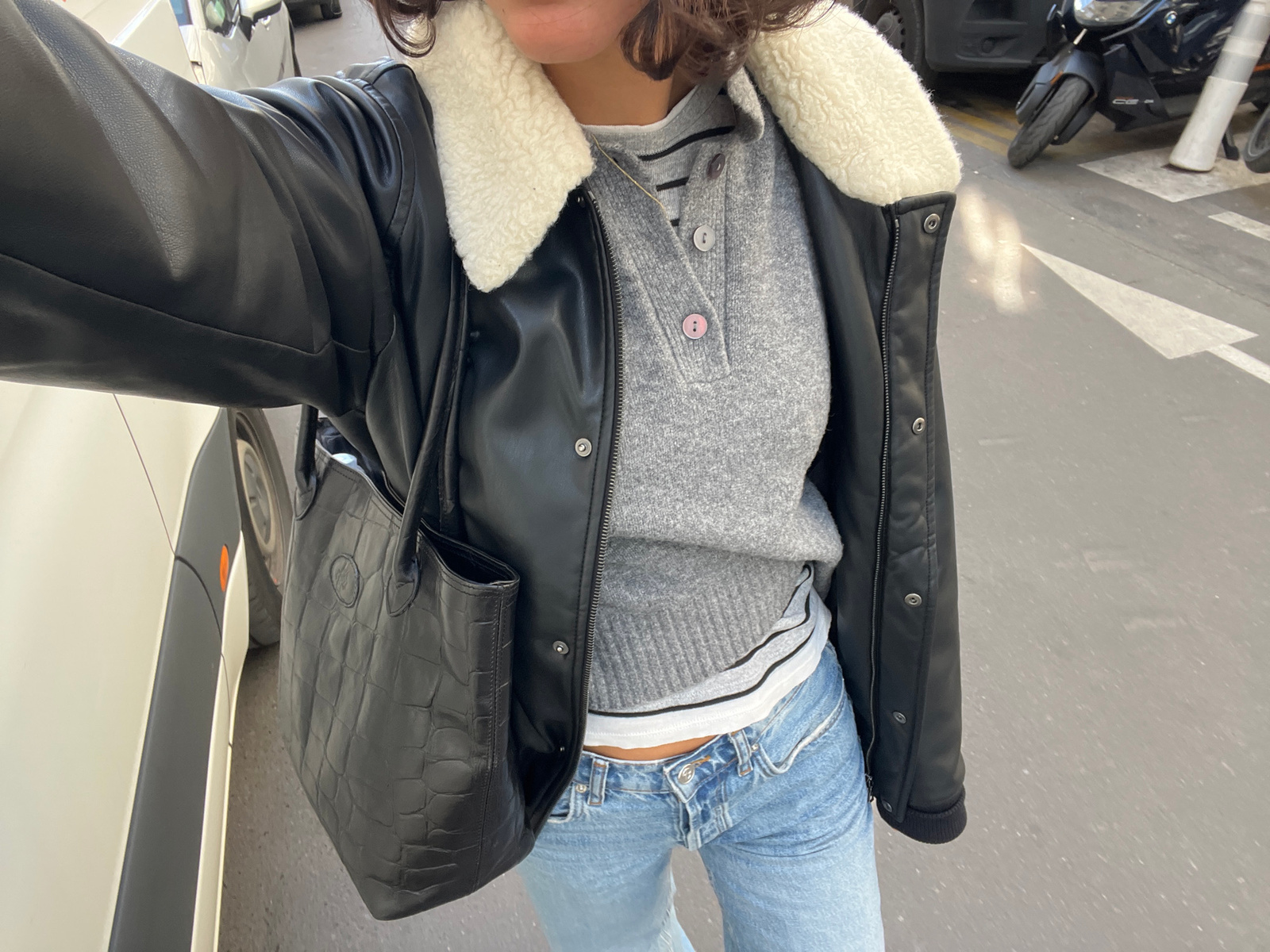 A downward-angled, portrait-oriented photograph depicts a person wearing light blue jeans, a grey sweater over a striped top, and a black leather jacket with white, woolly lining. The jeans show the w…read more