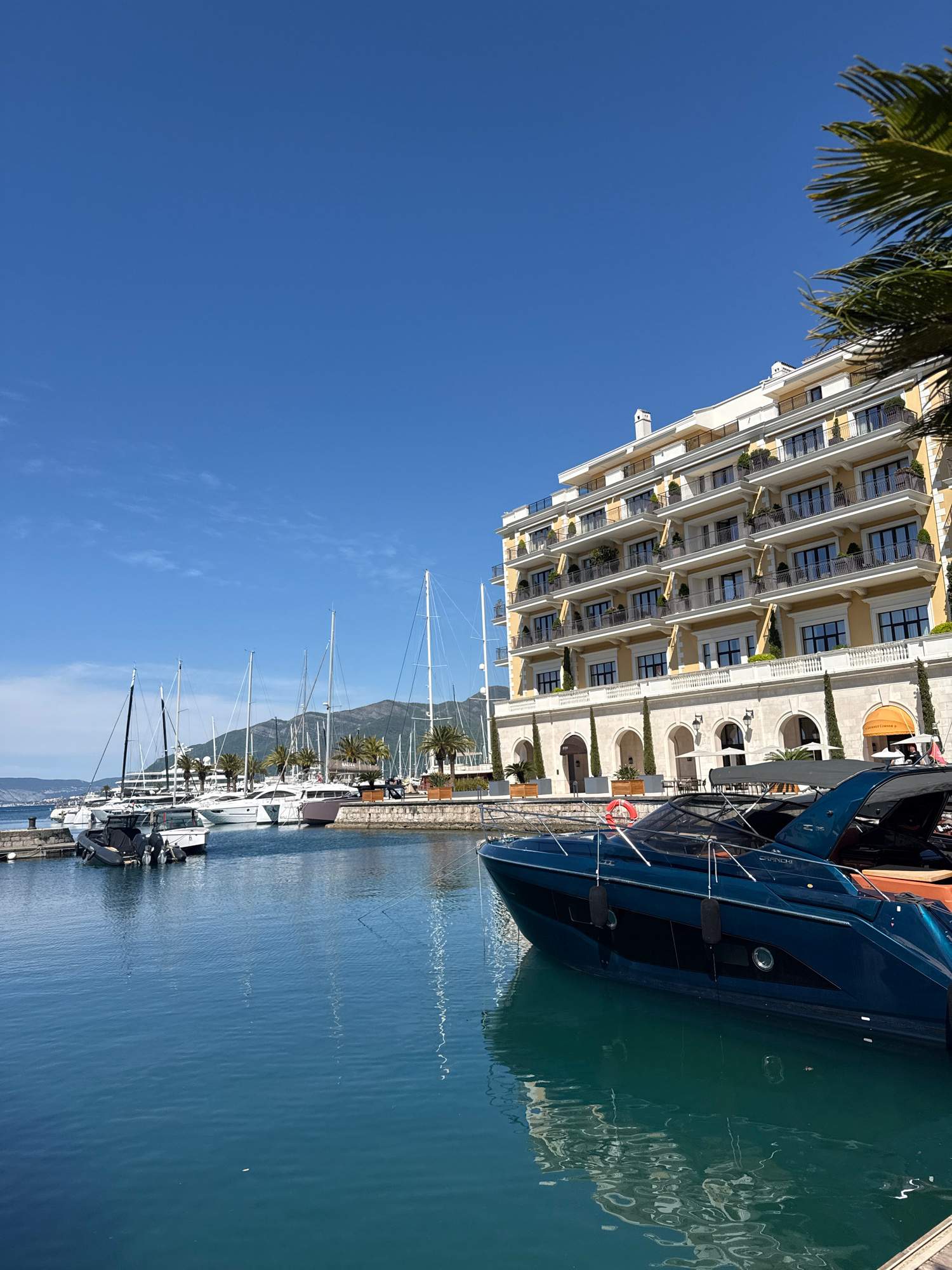 The image, oriented correctly, captures a vibrant marina scene under a clear blue sky in Tivat, Montenegro. In the upper left corner, the green fronds of a palm tree partially obscure the sky. A gran…read more