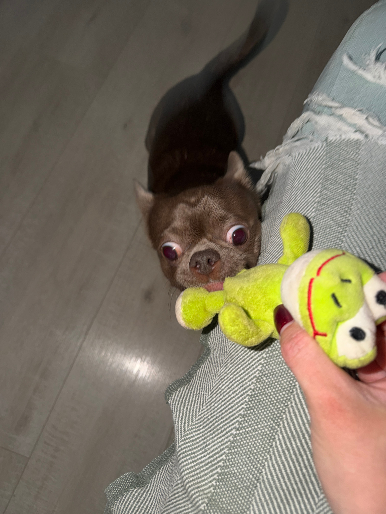 A tan Chihuahua is biting a green frog toy, held by a hand with burgundy nail polish. The dog is in front of a herringbone pattern textile. The image is taken on a wood floor. The image location canno…read more