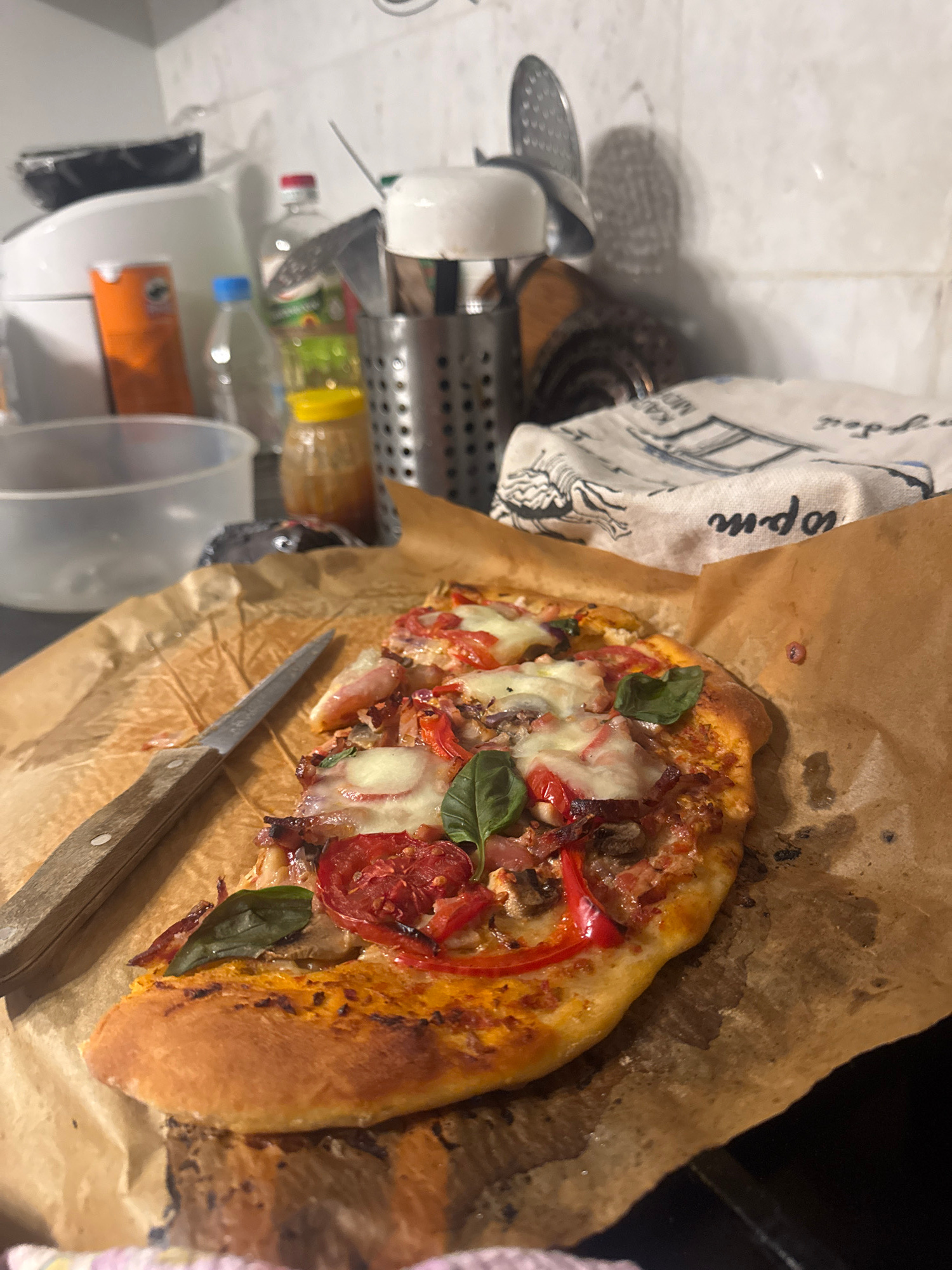 A freshly baked homemade pizza is the central focus of this indoor kitchen scene, presented on crumpled brown parchment paper. The pizza is generously topped with melted mozzarella cheese, sliced red…read more