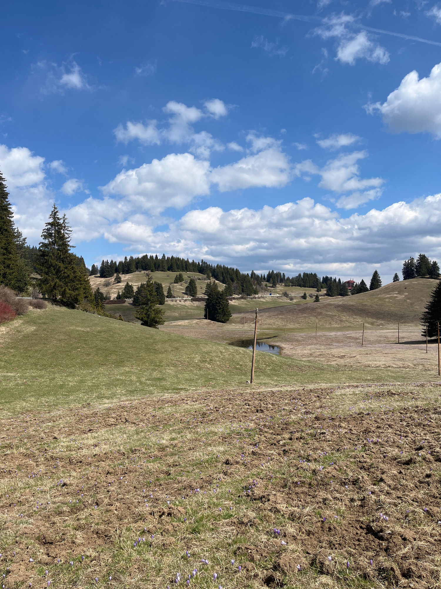 The image depicts a hilly landscape under a partly cloudy sky. A field with a mixture of green grass and patches of brown soil with small purple flowers is on the right side of the image. Further back…read more