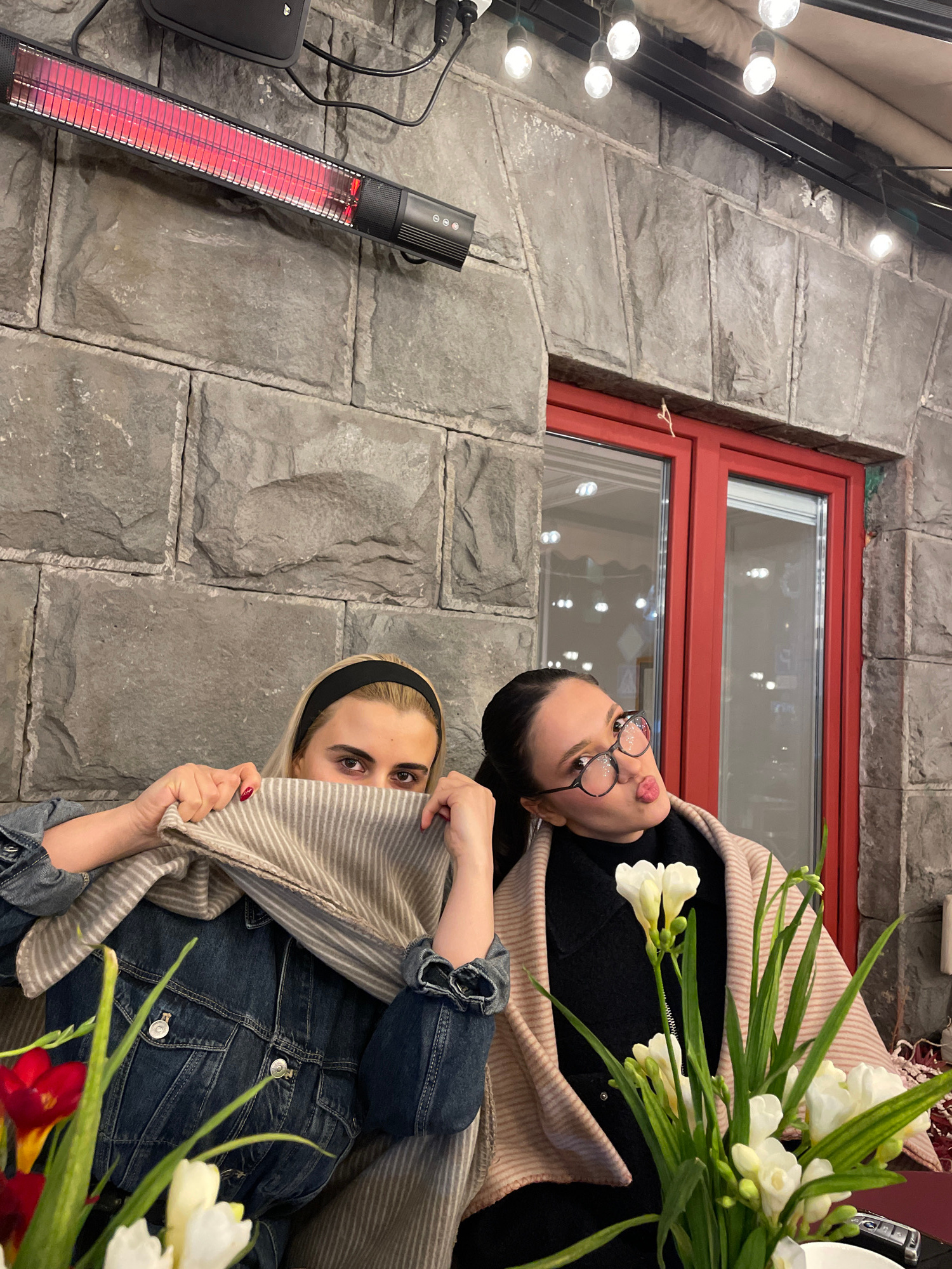 Two women are posing for a photo outdoors. One woman with dark hair and glasses is facing the camera and pouting, while the other, wearing a black headband and a denim jacket, is partially covering he…read more