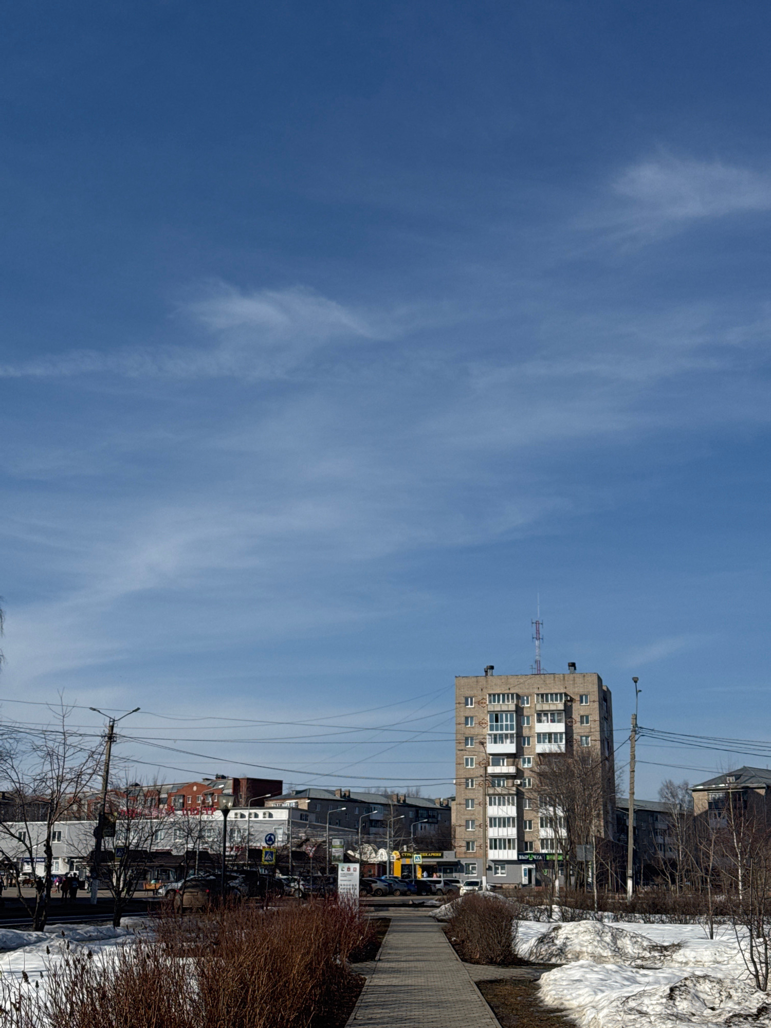 The image shows a cityscape, likely in Chernushka, Russia, with an emphasis on the sky and buildings. The sky is a bright blue with wispy, elongated clouds. An apartment building with multiple floors…read more