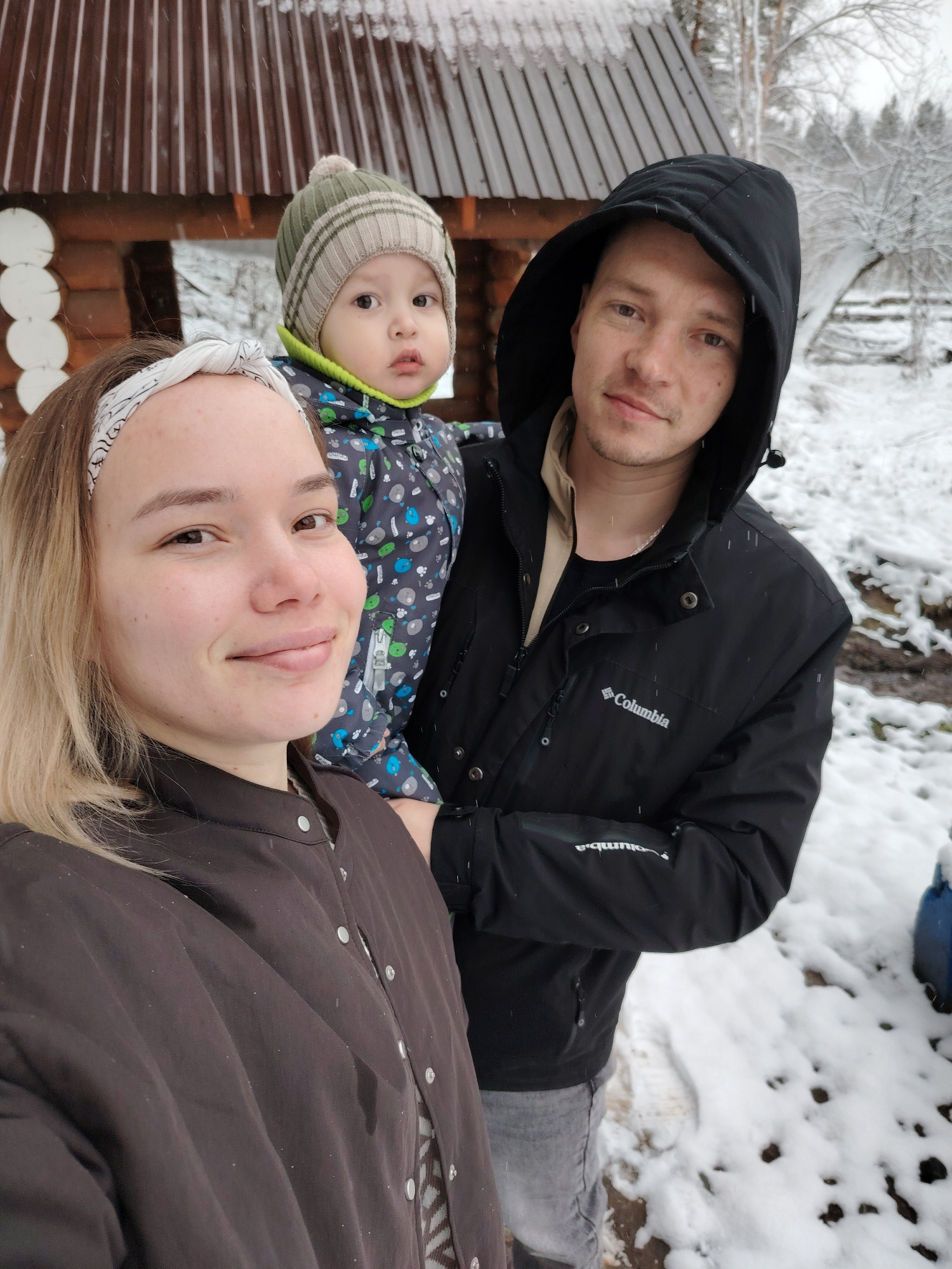 Three people stand together in a snowy environment. A young woman with blonde hair and a white headband is positioned on the left. A man wearing a black hooded Columbia jacket stands to her right, hol…read more