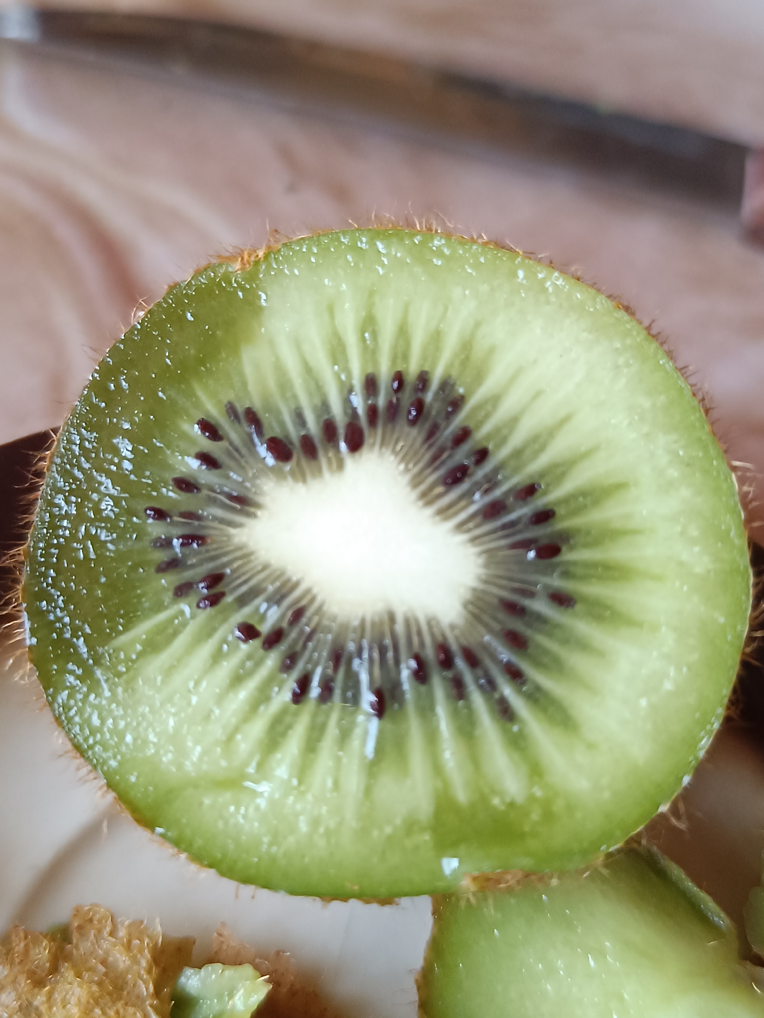 A close-up, top-down shot features the cross-section of a freshly sliced kiwi fruit, dominating the center of the frame. The kiwi exhibits its characteristic vibrant green flesh, which appears juicy a…read more