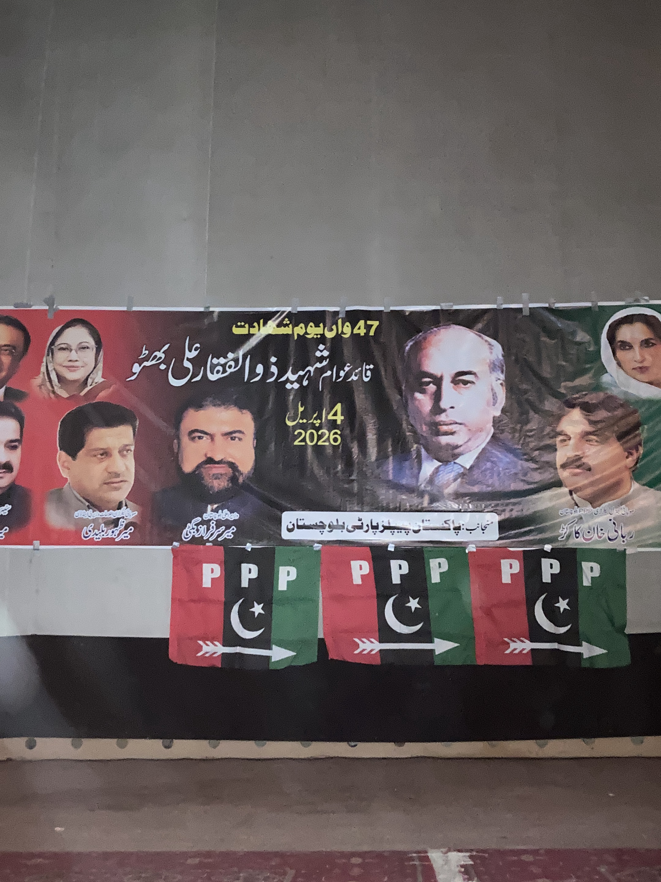 A banner hangs against a neutral-colored wall. The banner commemorates the 47th Martyrdom Day of leader Zulfiqar Ali Bhutto on April 4, 2026. The banner features photos of political figures. Several f…read more