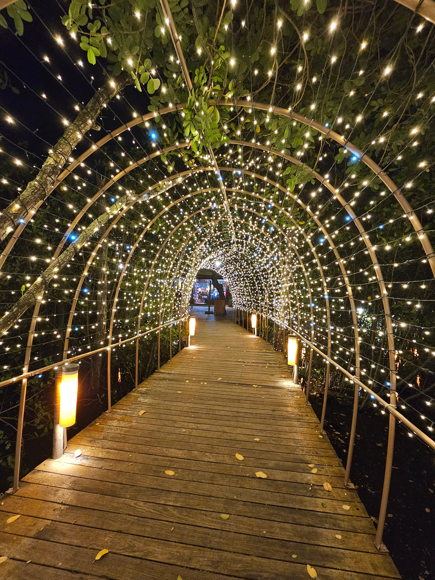 The image depicts a boardwalk tunnel illuminated by numerous small white lights. The tunnel structure is made of bamboo, with lights draped over the frames creating an archway effect. A wooden boardwa…read more