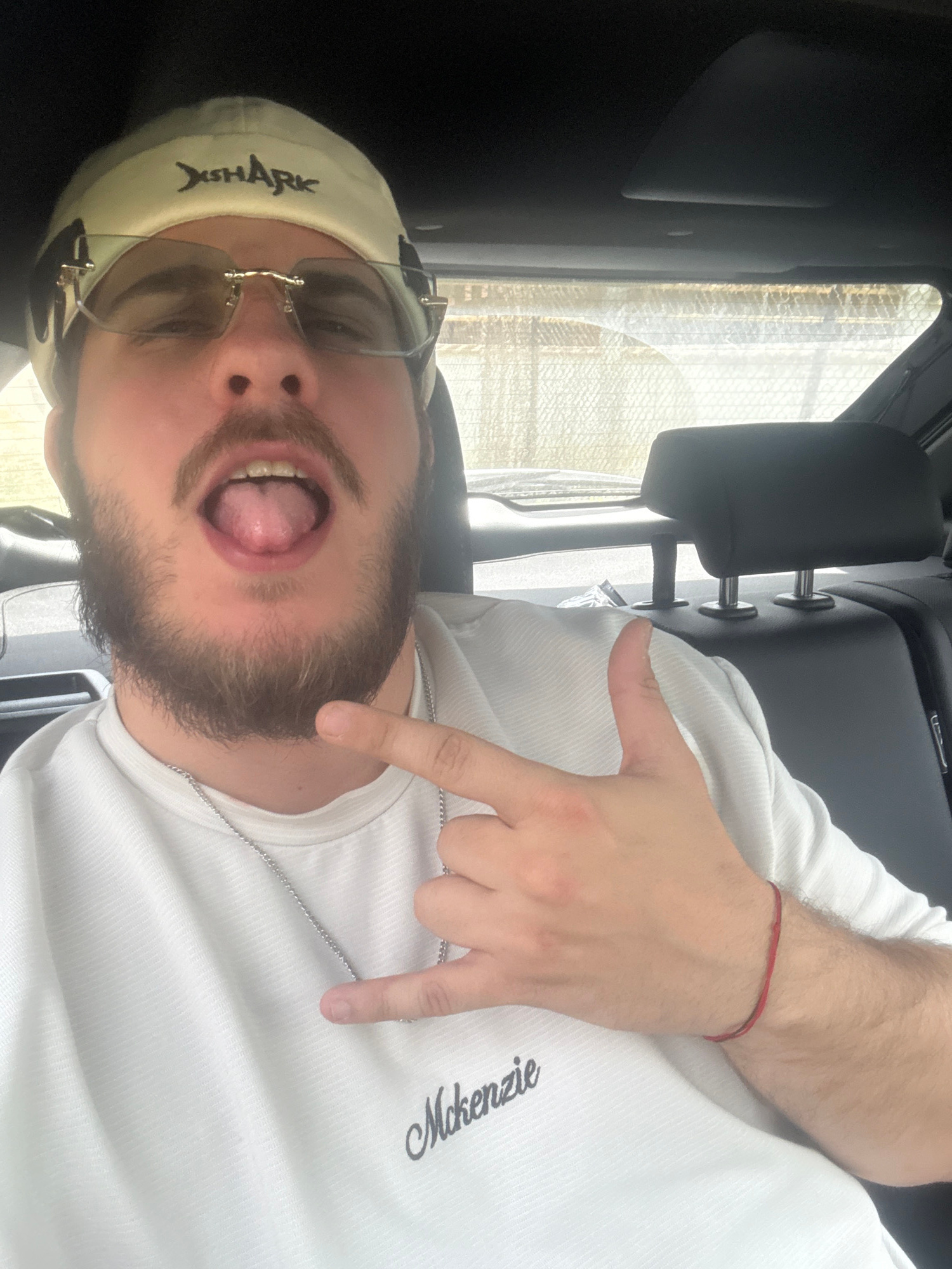 A bearded man wearing a white shirt with "Mckenzie" embroidered on it, a light-colored cap with "JSHARK" printed on it, and glasses, is in a vehicle. He is making a hand gesture with his tongue sticki…read more