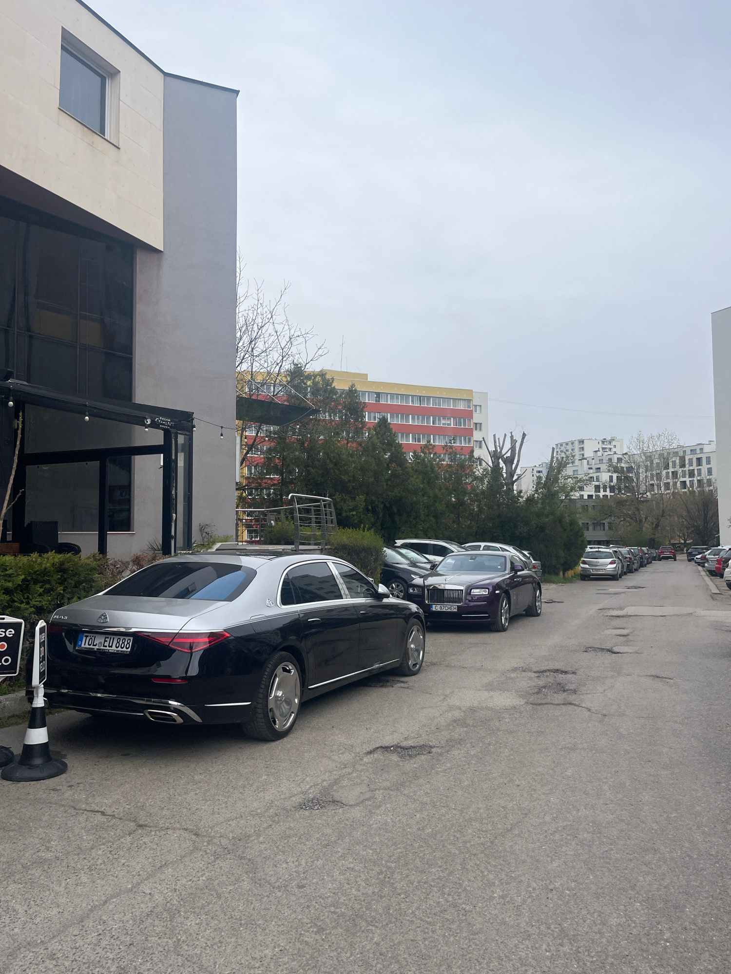 The image depicts a street scene in Sofia, Bulgaria, characterized by a line of parked cars. In the foreground, a black and silver Mercedes-Maybach with license plate "TÖL EU 888" is parked next to a…read more