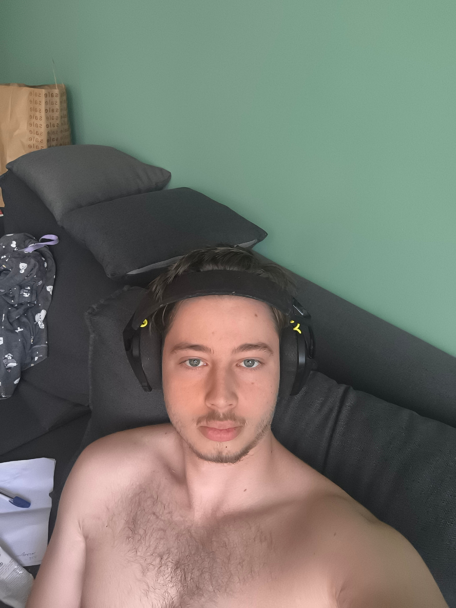The image shows a young, light-skinned man with short dark hair, blue eyes, and light facial hair (stubble/goatee), positioned centrally. He is bare-chested, revealing chest hair, and wears black over…read more