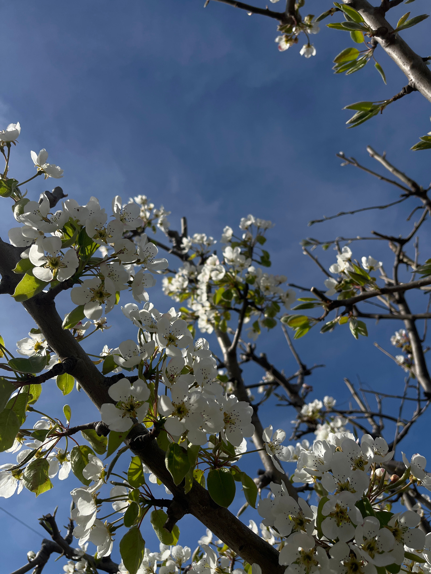 The media file displays a natural scene captured from a low angle, looking up through the branches of a blooming tree against a clear blue sky. The primary subjects are numerous white blossoms and eme…read more
