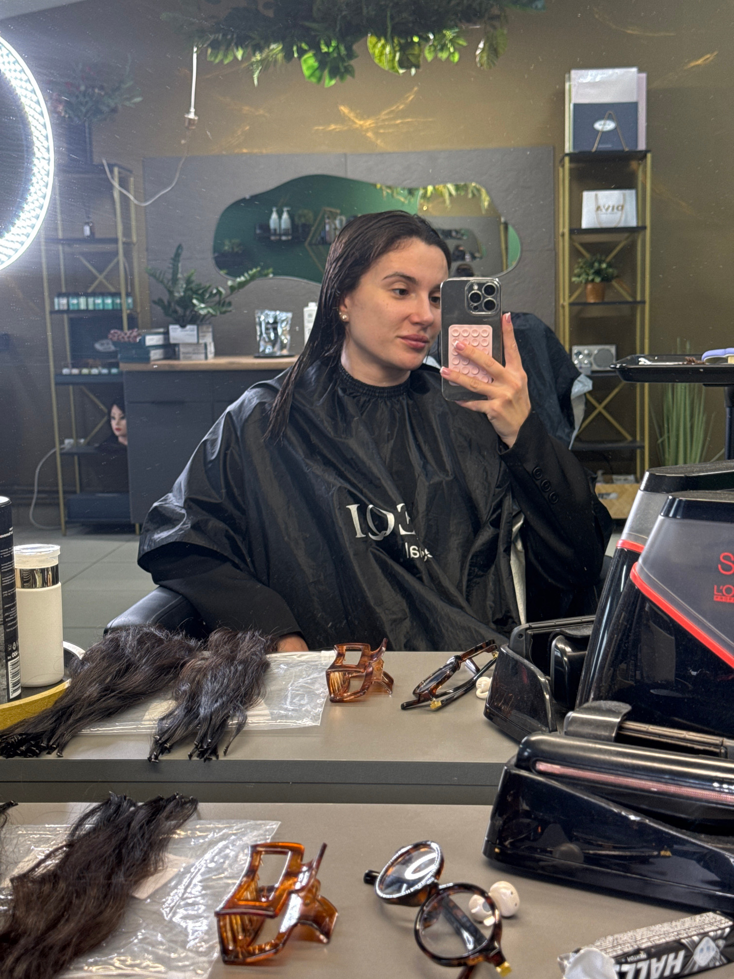 A woman with dark hair, wearing a black salon cape over a black blazer, is taking a selfie in front of a mirror in a salon in Chaikovsky, Russia. She is holding an iPhone with a pink and white pattern…read more