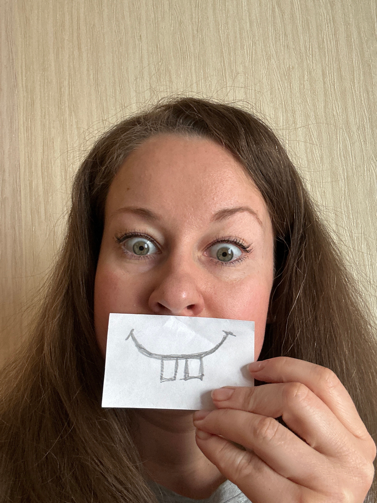 A woman with long brown hair is holding a piece of paper with a crude drawing of a smiling face over her mouth. Her eyes are wide and slightly bulging. The background is a light-colored, possibly wood…read more