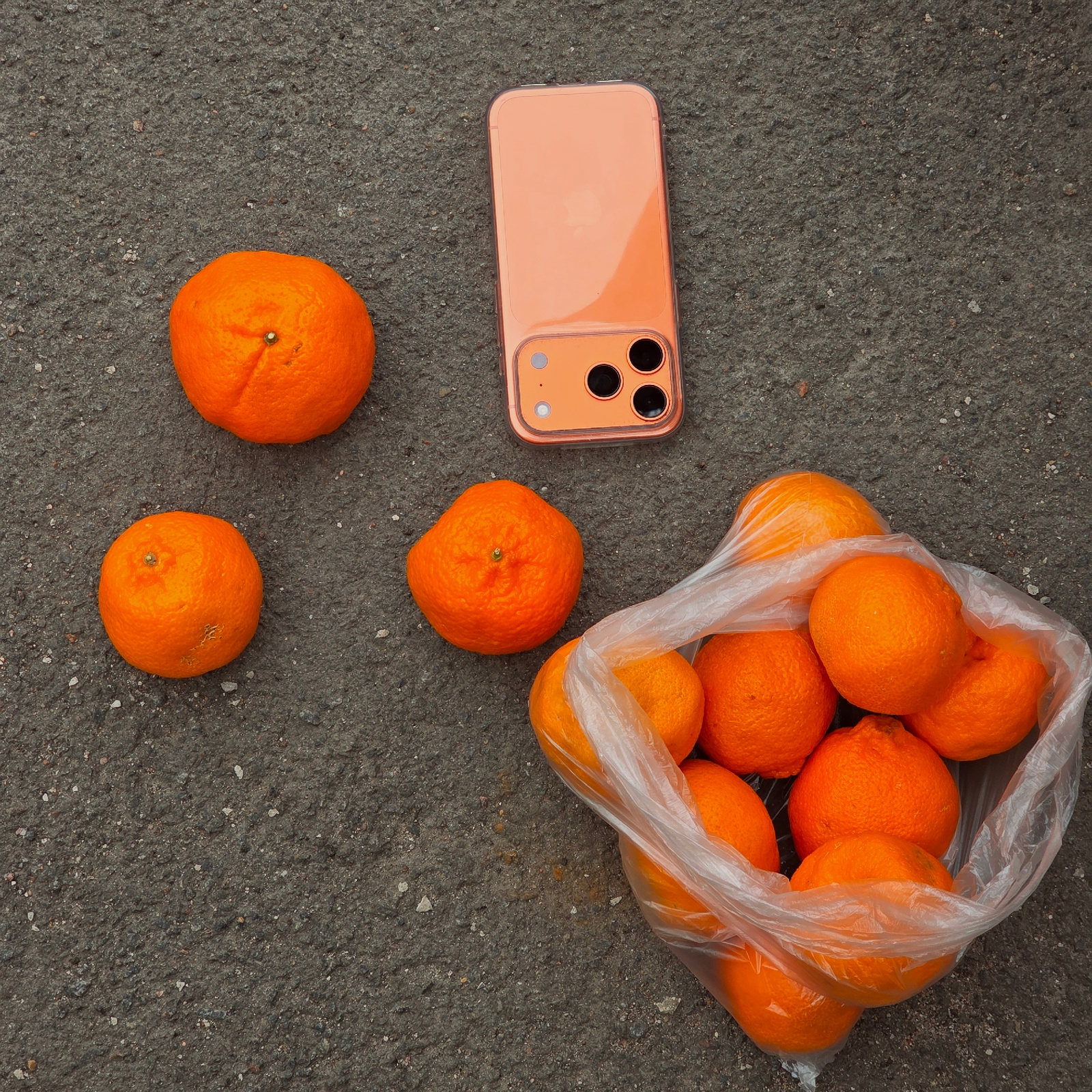 The image shows a bag of oranges and a smartphone on a gray asphalt surface. There are approximately 10 oranges in a clear plastic bag. Next to the bag is a smartphone with an orange case. Three loose…read more