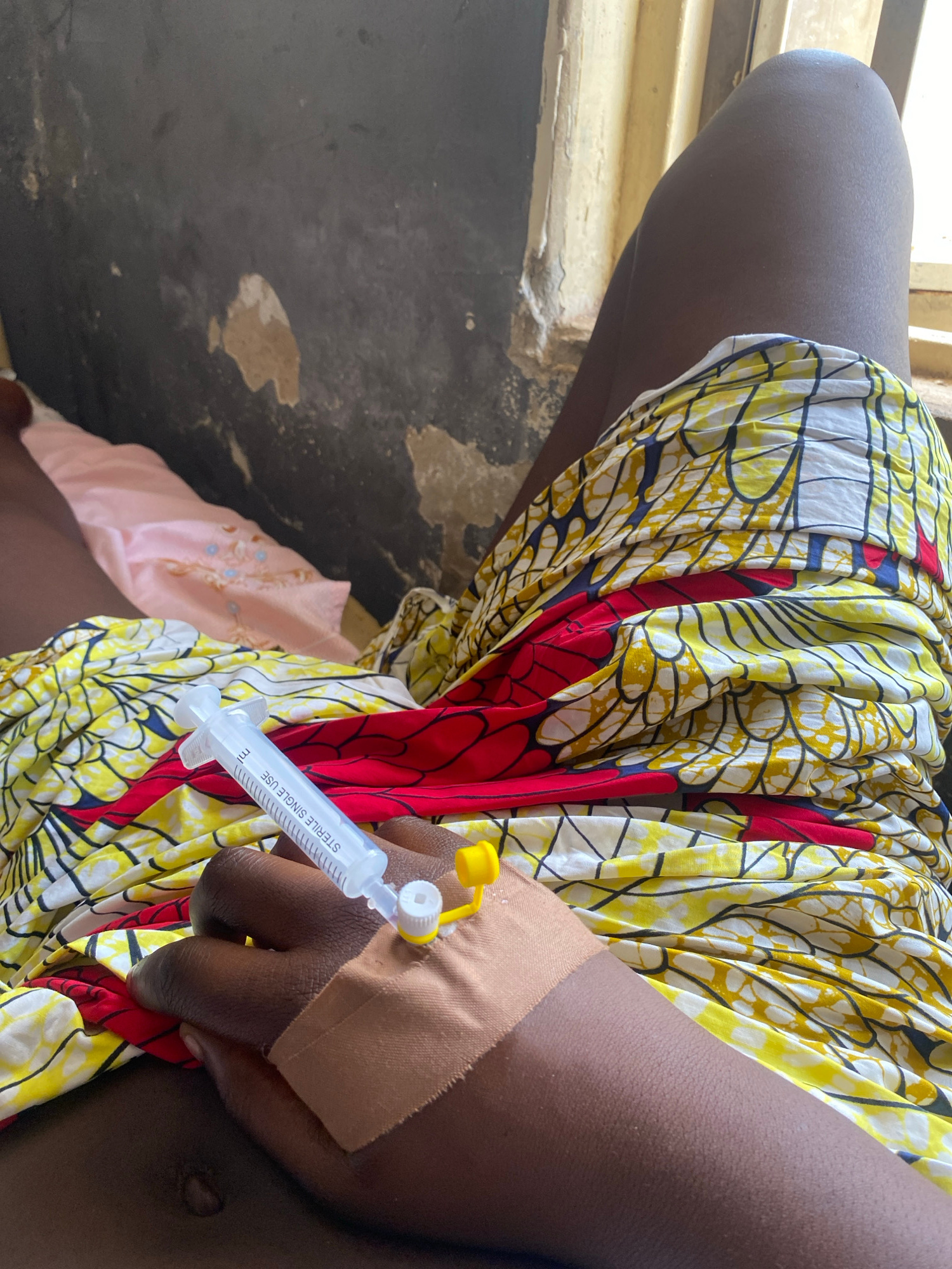 A person is seen sitting, their hand secured with a tan bandage and connected to a clear plastic syringe with a yellow and white cap. The syringe is labeled "STERILE SINGLE USE." They are wearing a co…read more