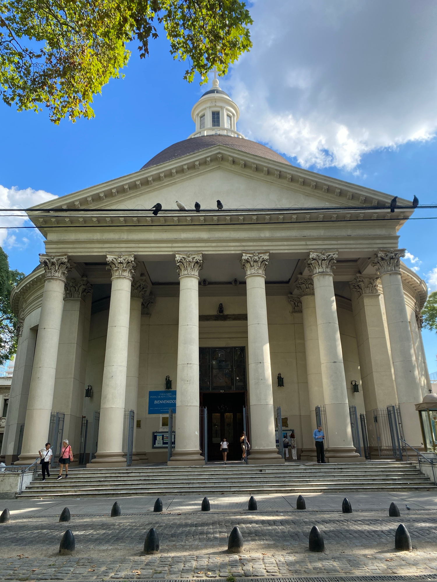 The image depicts the Church of the Immaculate Conception in Buenos Aires, Argentina. The building has a neoclassical façade with tall Corinthian columns supporting a triangular pediment. A dome rises…read more