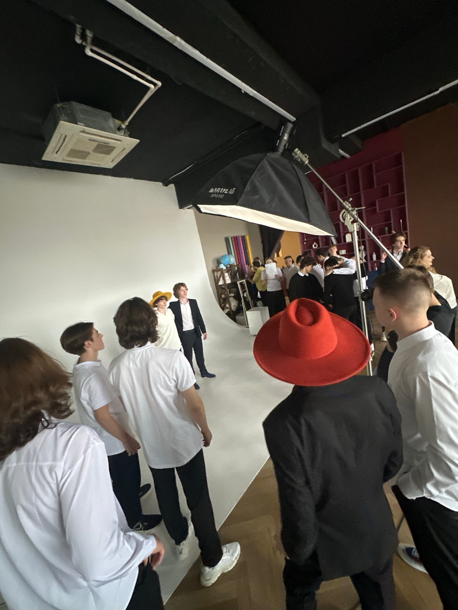 The image depicts a photo studio with a white backdrop where a group of people are posing for a picture. Some individuals are lying down, wearing white shirts and black pants, while one person in the…read more