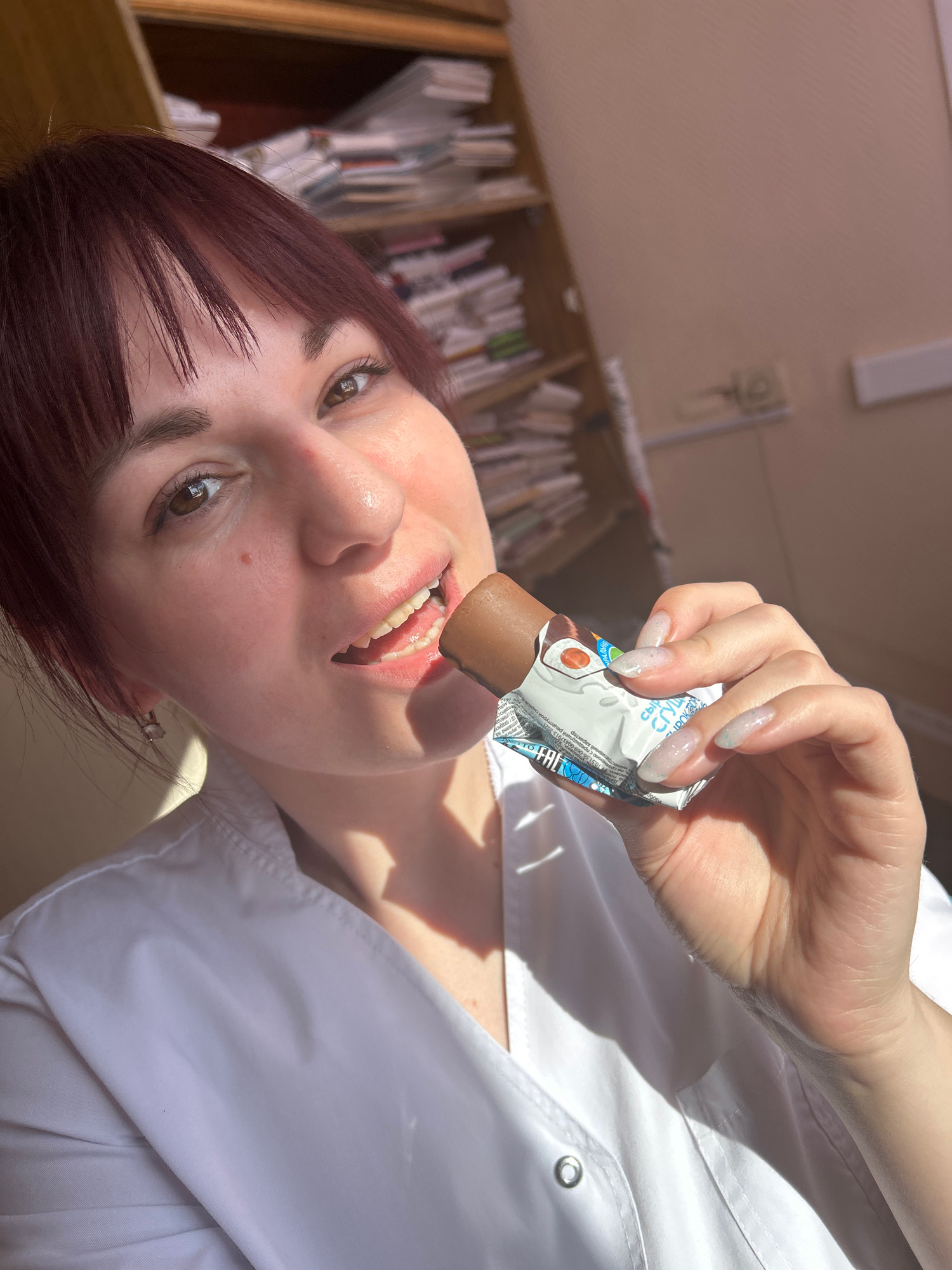 A woman with burgundy hair and fair skin is holding a chocolate bar to her mouth. She is wearing a white collared shirt. Her fingernails are long and have a clear design with glitter. The background i…read more