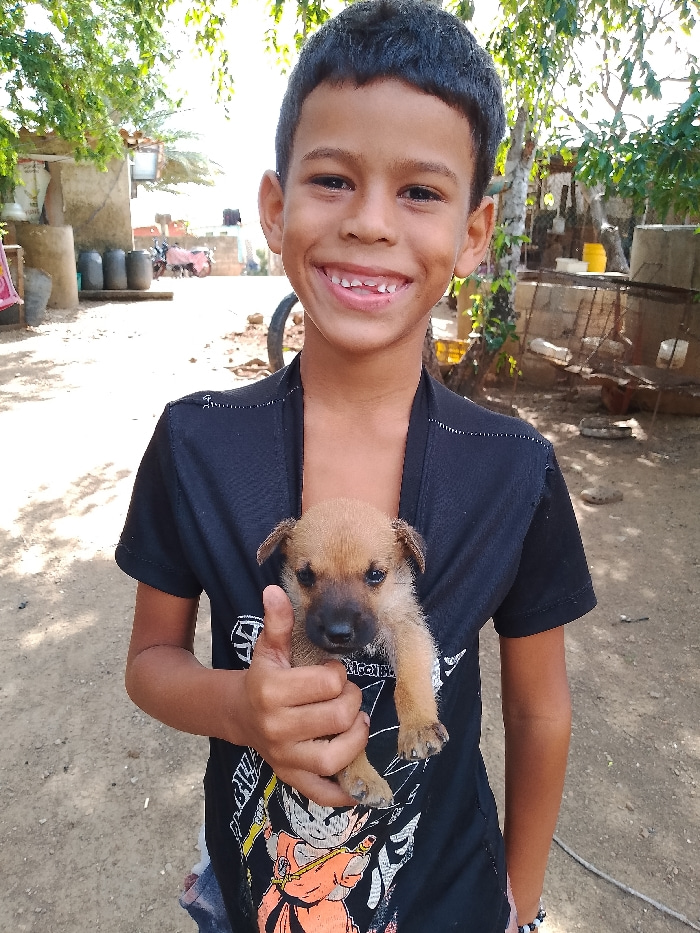 A smiling young boy holds a small brown puppy nestled inside his black Dragon Ball Z T-shirt. He's outdoors, possibly in a yard, with trees overhead. The background reveals a glimpse of buildings andβ¦read more