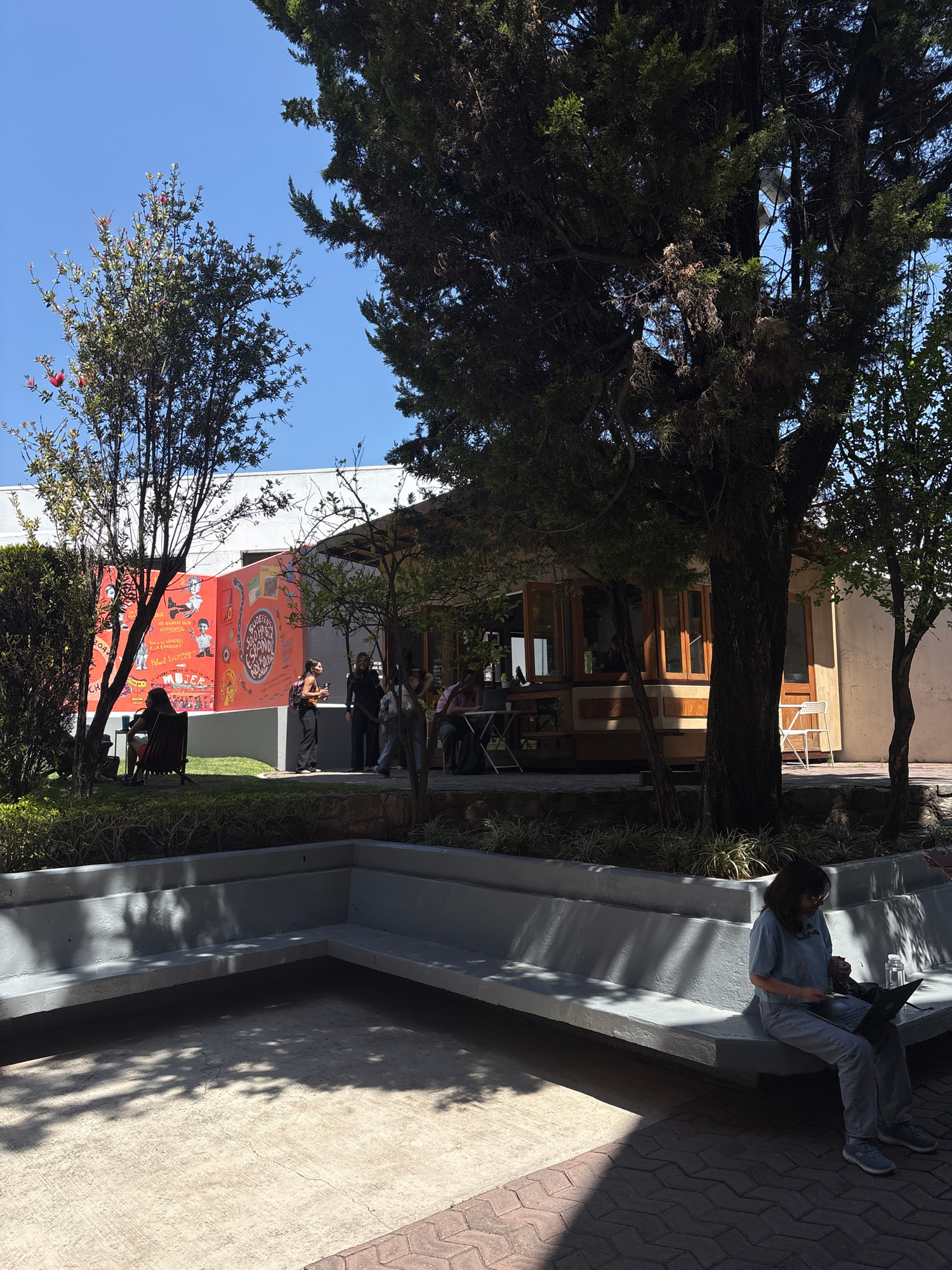 The image depicts an outdoor scene in San Andrés Cholula, Mexico, possibly on a university campus or a similar public space. A young person is sitting on a concrete structure that appears to be a benc…read more