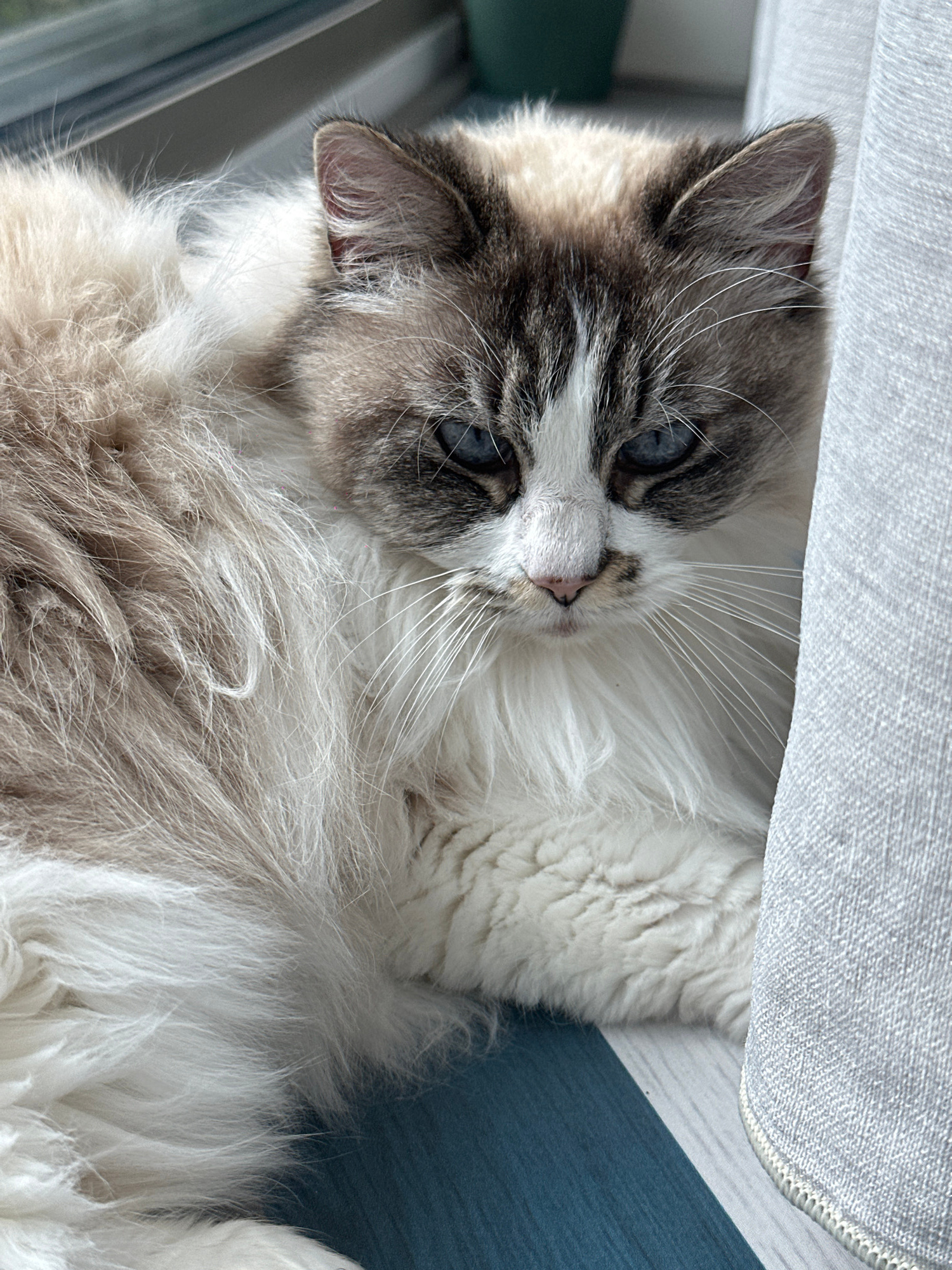 A light-colored cat with prominent blue eyes and long, fluffy fur is the central subject of this image. The cat's face is partially obscured by a light grey, textured fabric surface, possibly a cushio…read more