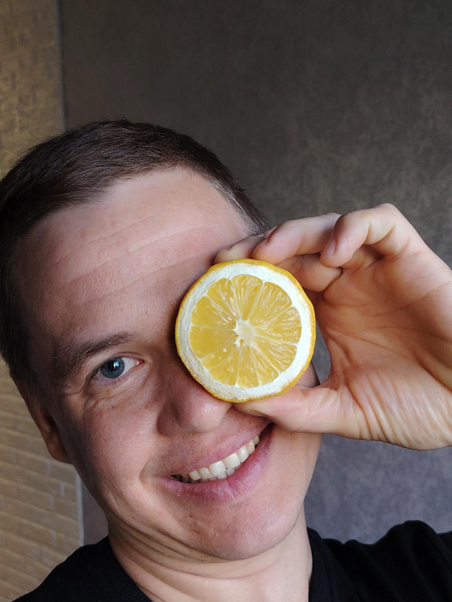 A smiling man with short brown hair and blue eyes is holding a slice of lemon over his right eye. The man is wearing a black shirt. The background appears to be a wall with a subtle texture. There is…read more