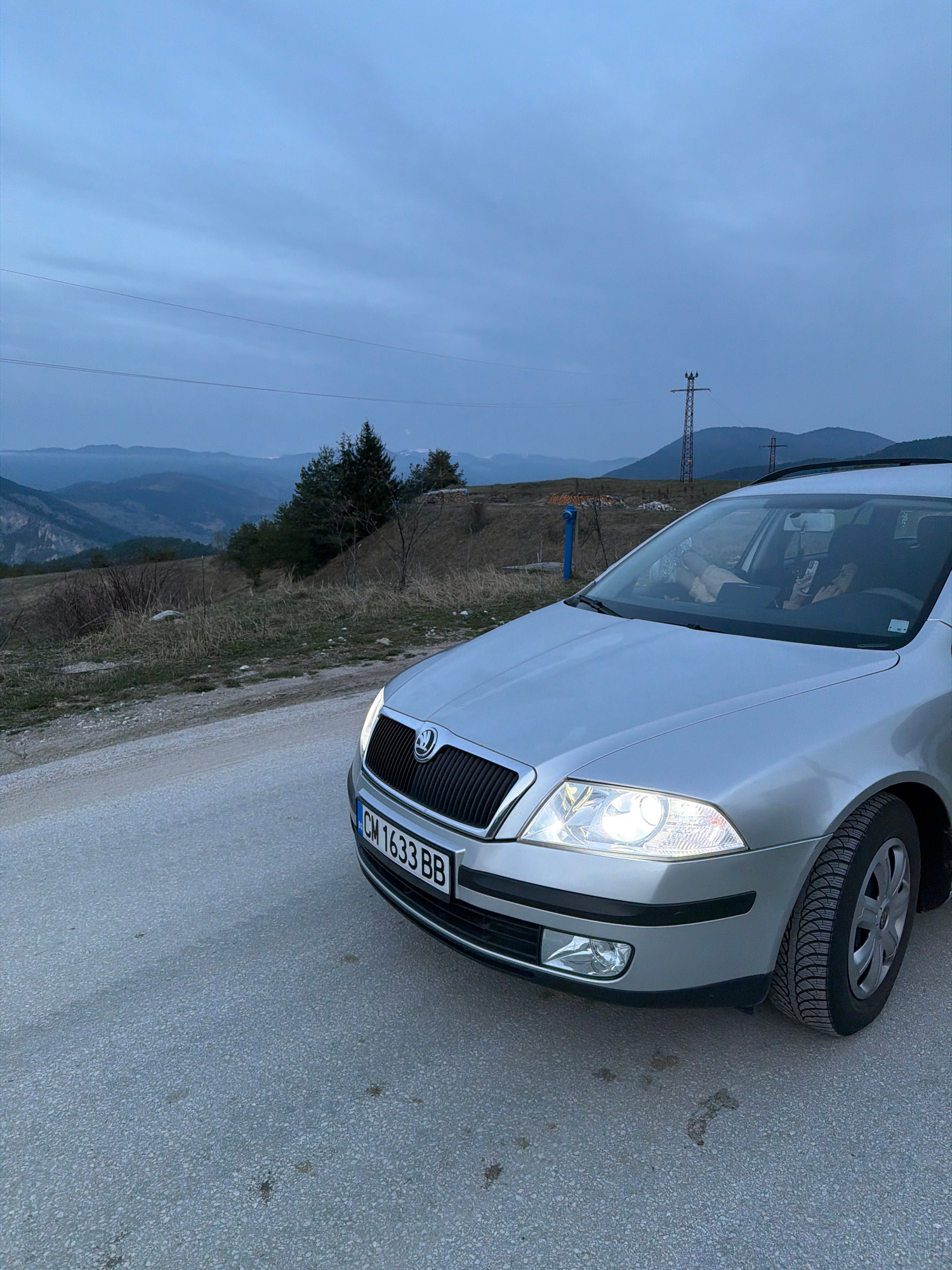 A silver Škoda Octavia, registered as "CH 1633 BB", is parked on the side of a paved road in a mountainous area. The license plate indicates it is registered in the city of Chala, Bulgaria. The vehicl…read more