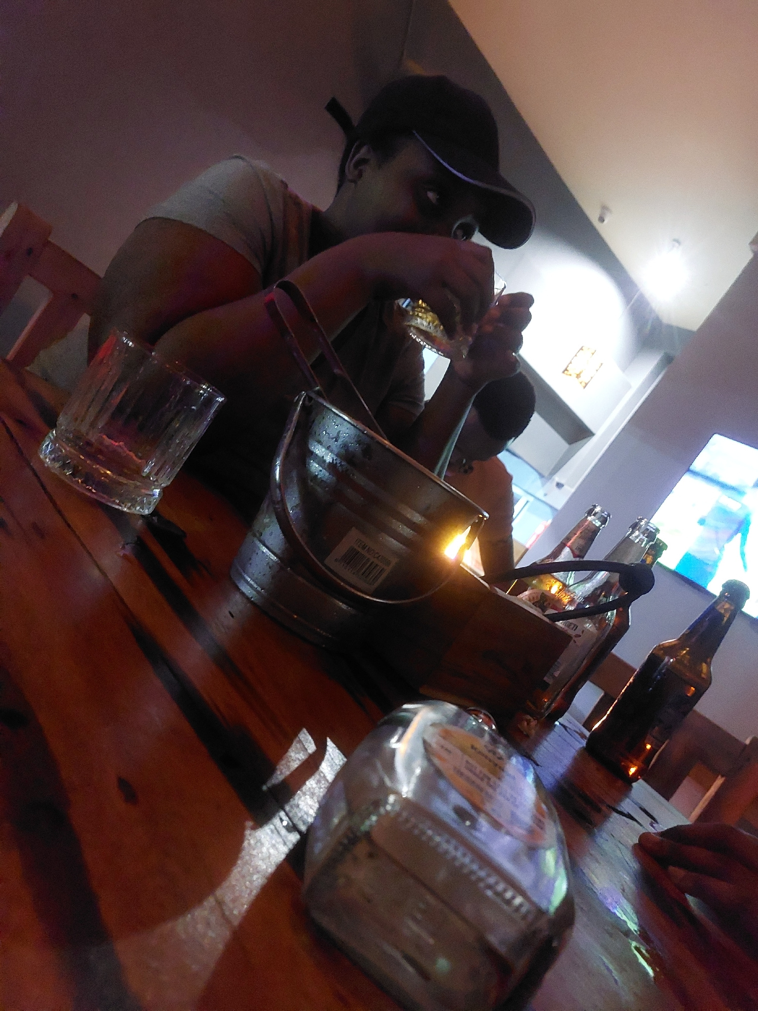 Here is a description of the image: **Setting:** The image appears to be taken inside a bar or pub. The lighting is dim, with a warm reddish hue. There's a wooden table as the main surface. The locat…read more