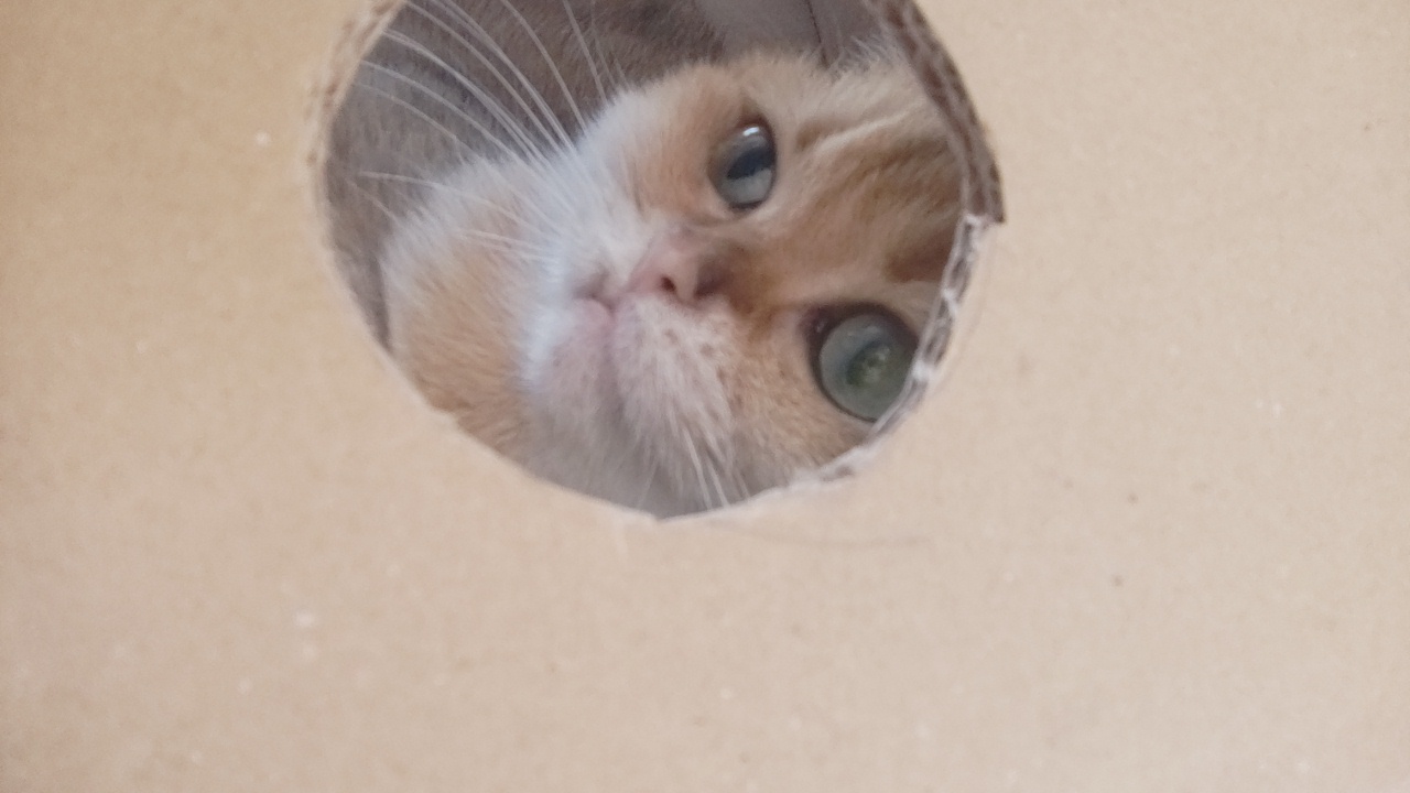 A close-up shot focuses on a golden-furred cat peering out of a cardboard box. The cat has large, green eyes and a pink nose, with a tiny bit of its tongue sticking out. The box is off-white and posit…read more