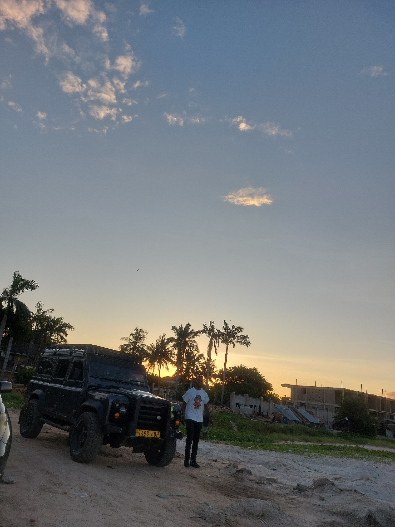 A man stands beside a black Land Rover Defender 110. The vehicle has a Tanzanian license plate, "T 498 EBH". Palm trees are behind them. The sky is a gradient of blue to orange, indicative of either s…read more