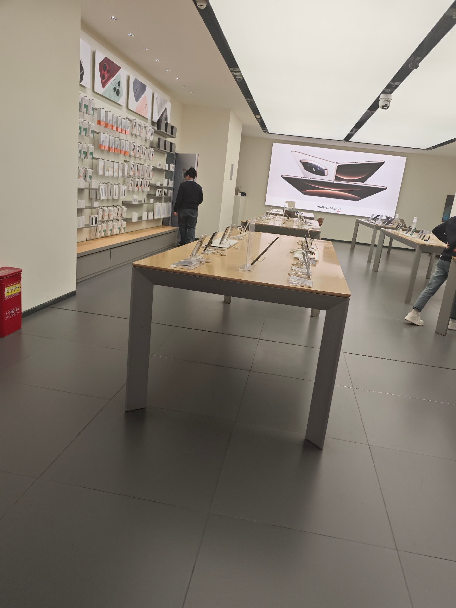 A showroom in Liangjiang, China, features a man in a black jacket examining products on shelves lined with electronic accessories. A table with product displays is in the foreground. Another individua…read more