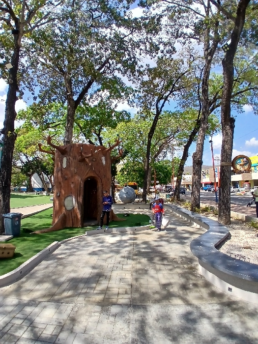 A park area features a fabricated tree trunk structure with hollowed windows and an entrance. Beyond the tree, two individuals in matching attire stand near a spherical object and a pathway. A winding…read more