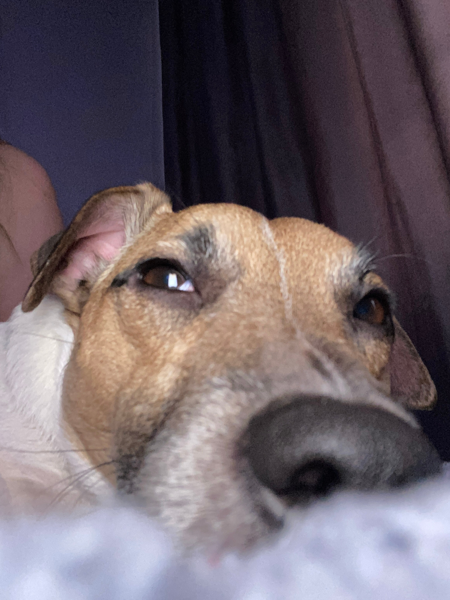A close-up, slightly tilted image features the face of a brown and white dog. The dog's nose is prominent and close to the camera, with one eye visible and reflecting light. A person's arm is visible…read more